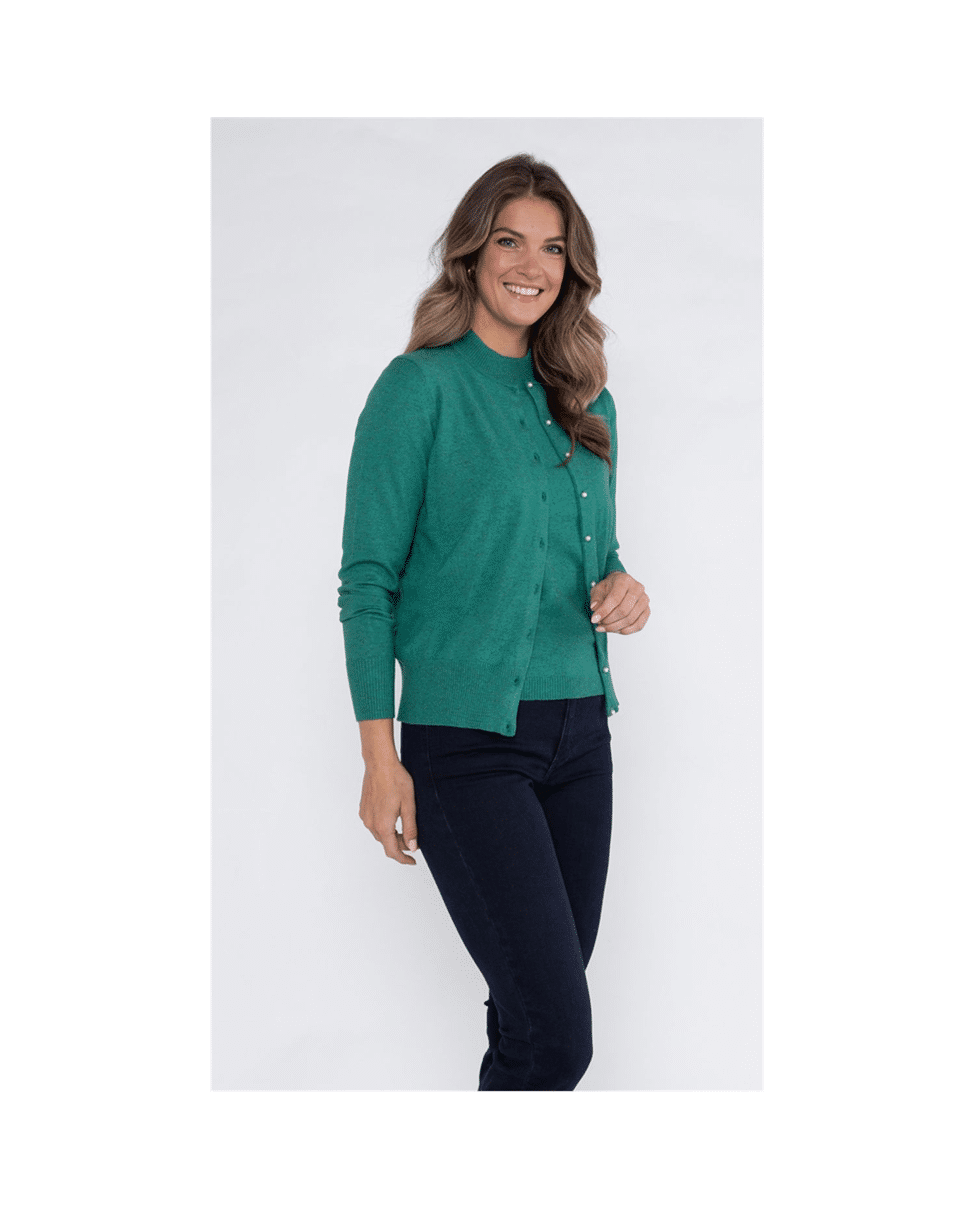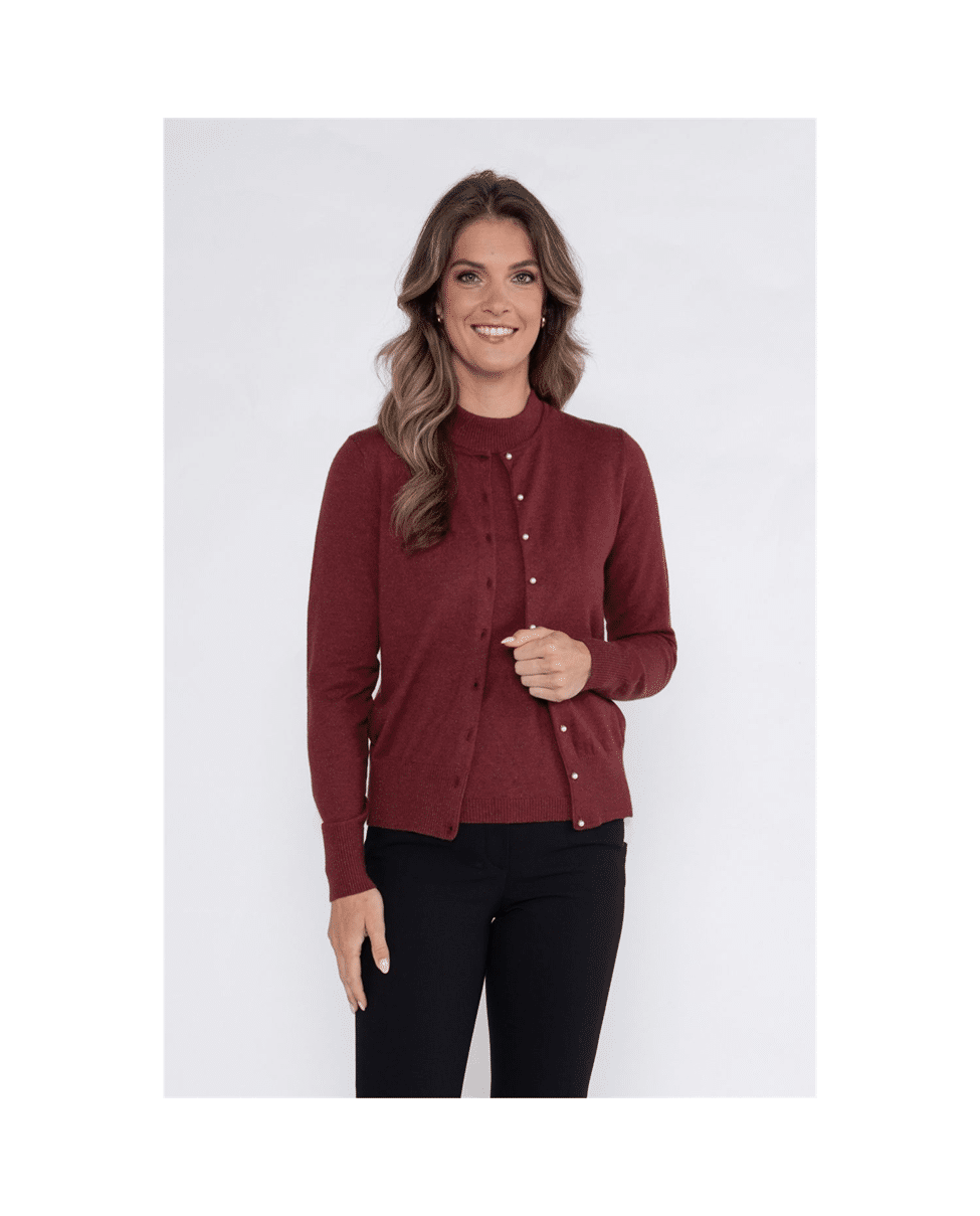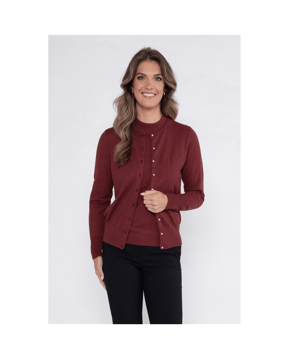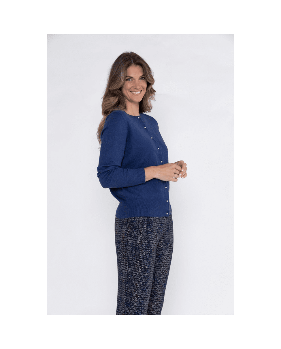 Een rond hals vestje uitgevoerd in een viscosemix met subtiel glansdraadje. De parelknopen geven dit tijdloze vest een elegante en vrouwelijke uitstraling.