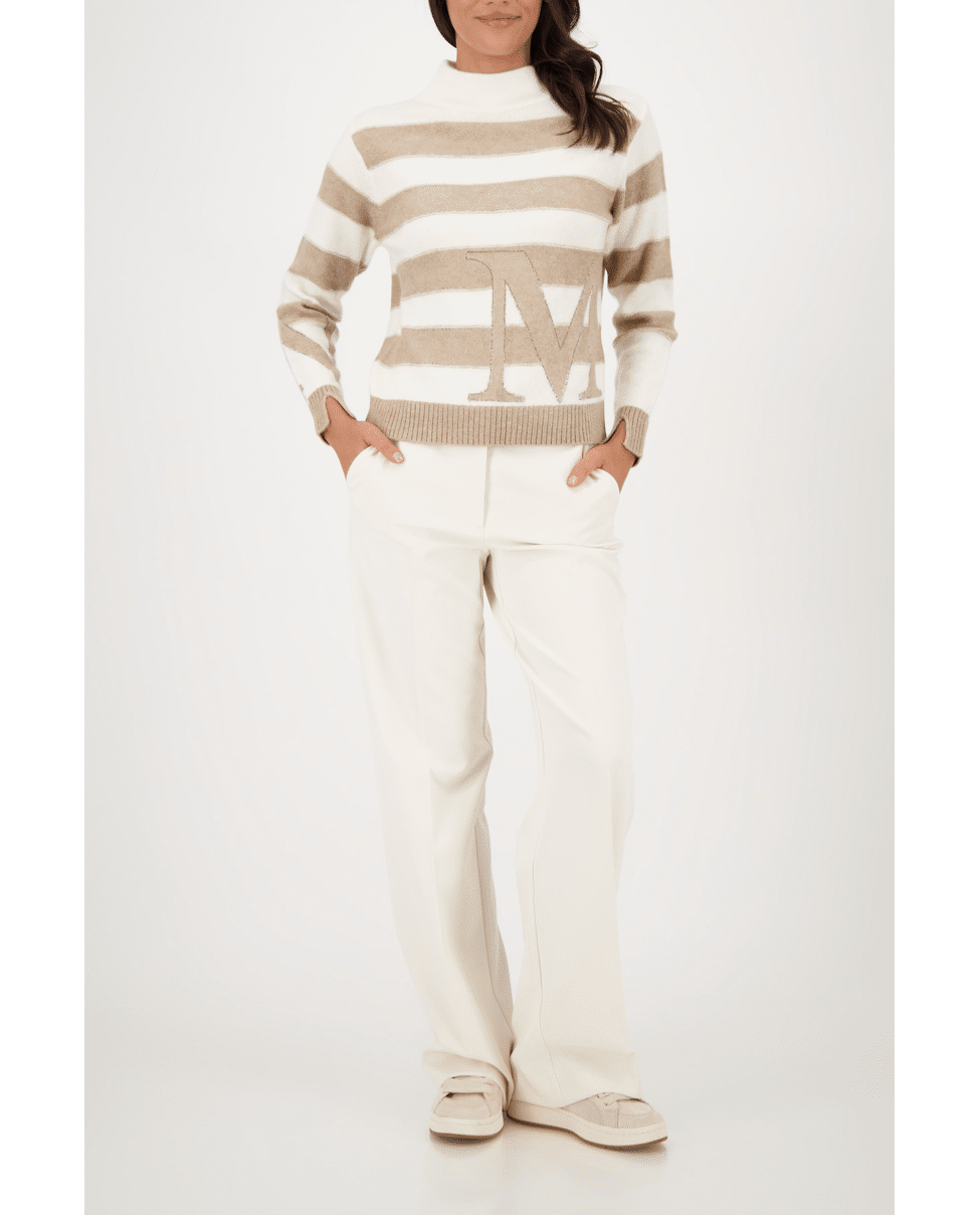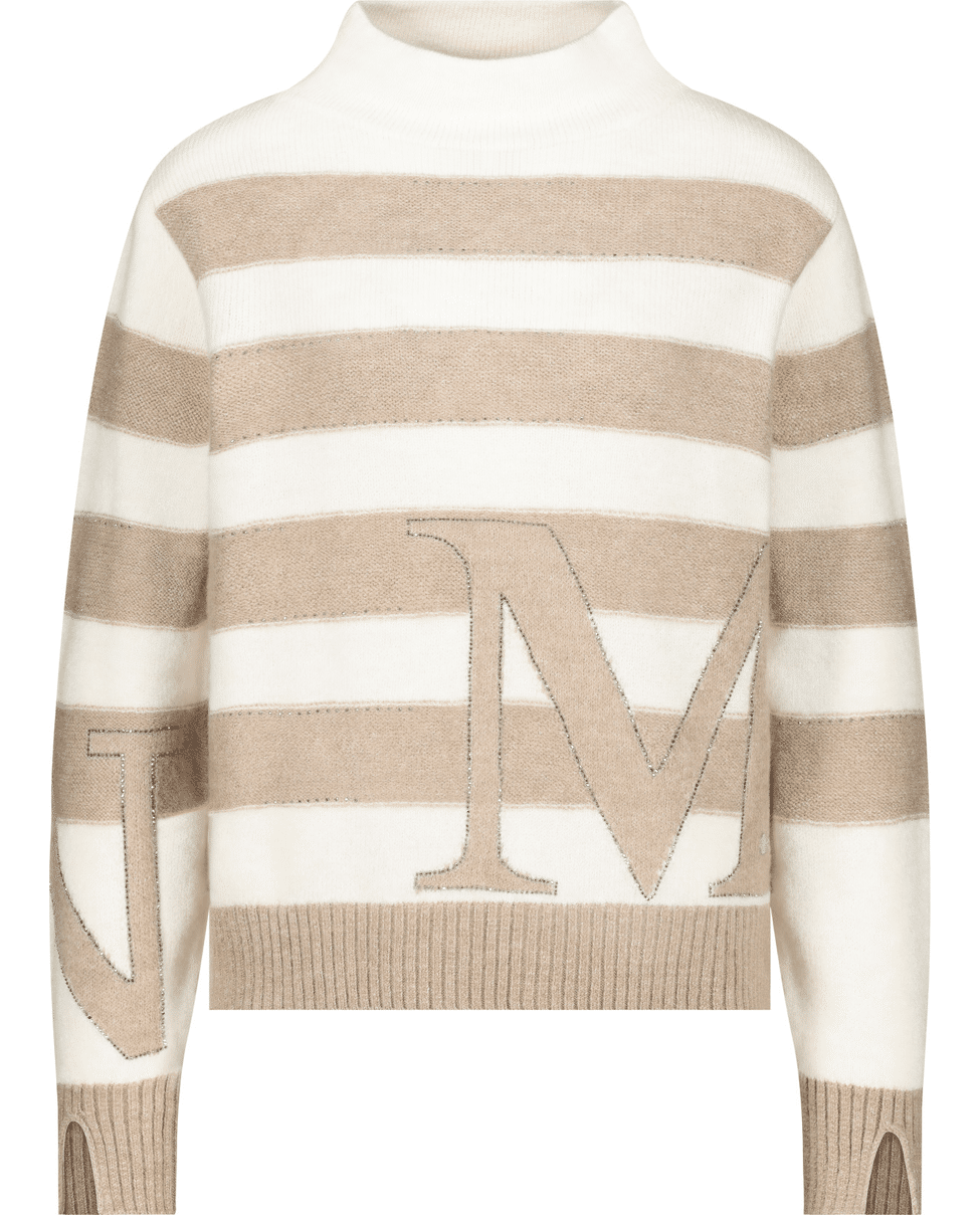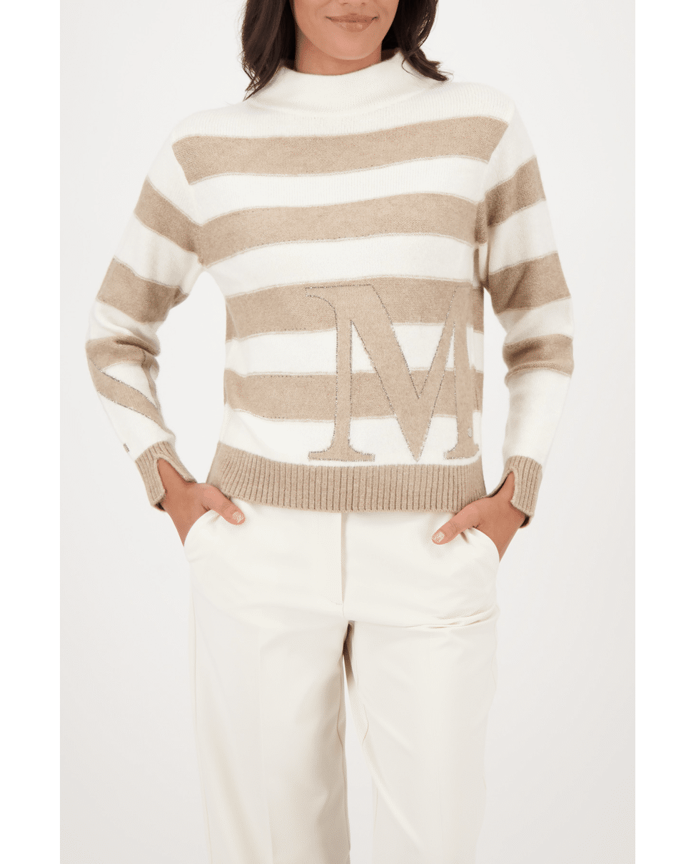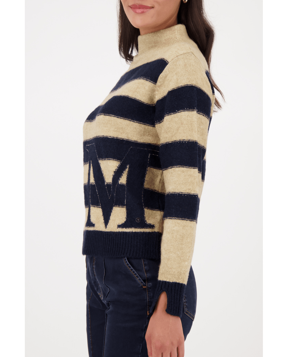 Deze gebreide trui met brede strepen en grote ‘M’-print is een echte blikvanger. Perfect voor casual dagen, met een comfortabele pasvorm en zachte feel.