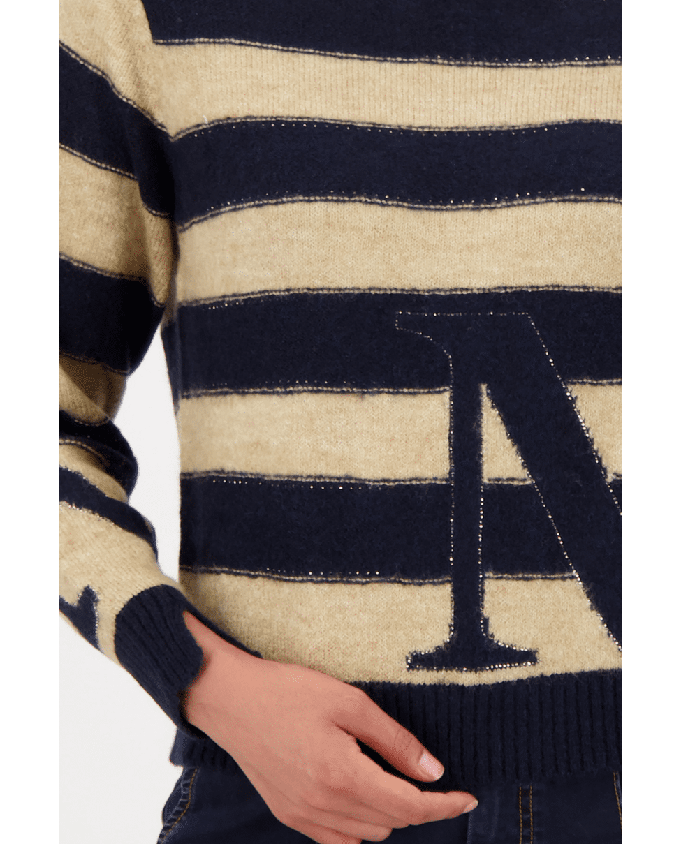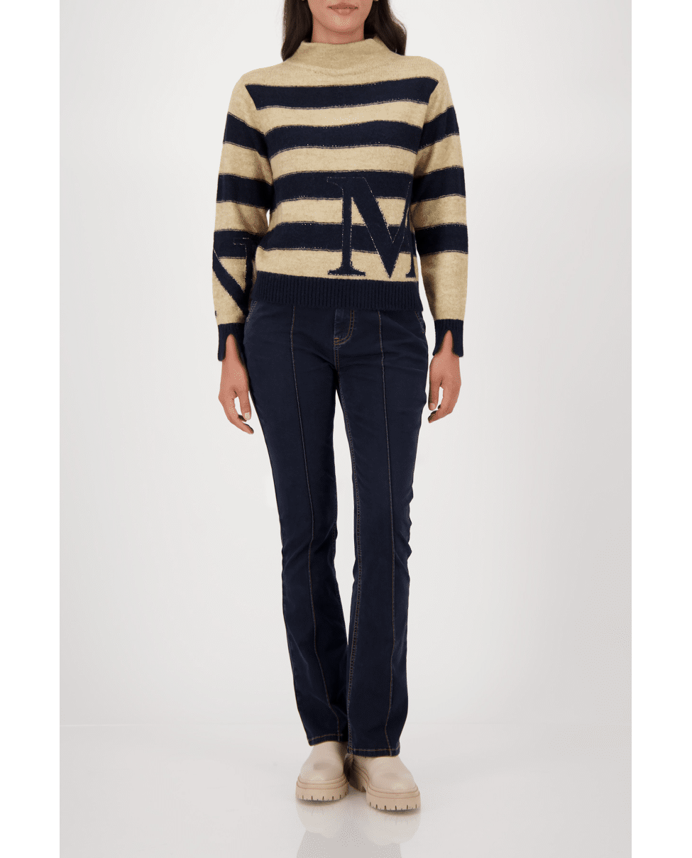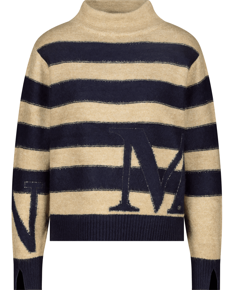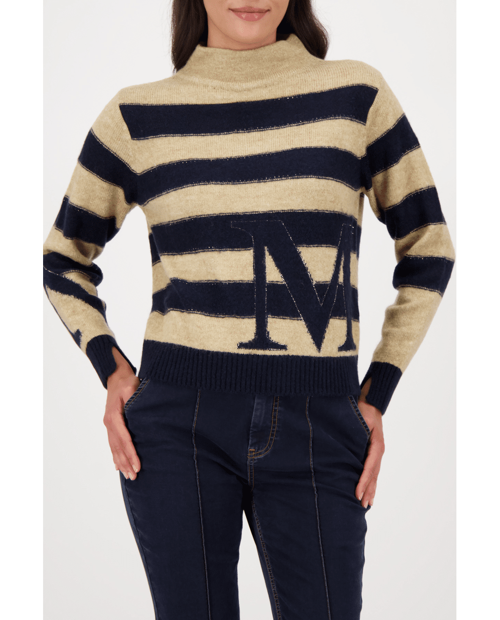 Deze gebreide trui met brede strepen en grote ‘M’-print is een echte blikvanger. Perfect voor casual dagen, met een comfortabele pasvorm en zachte feel.