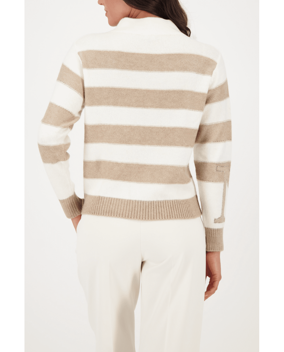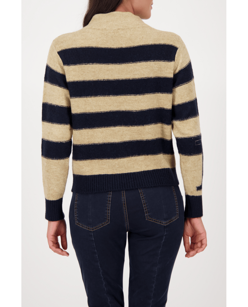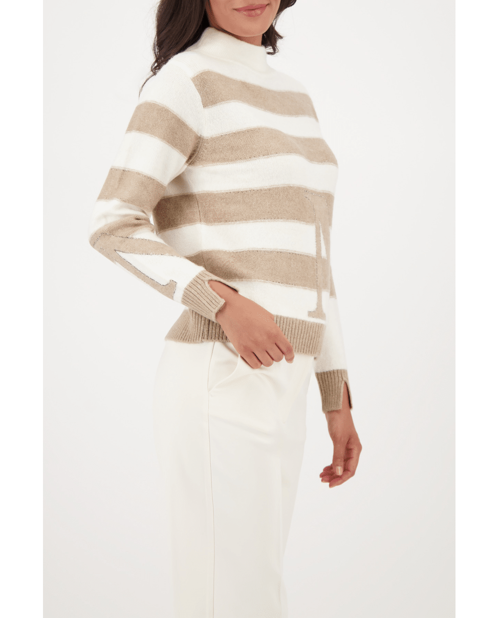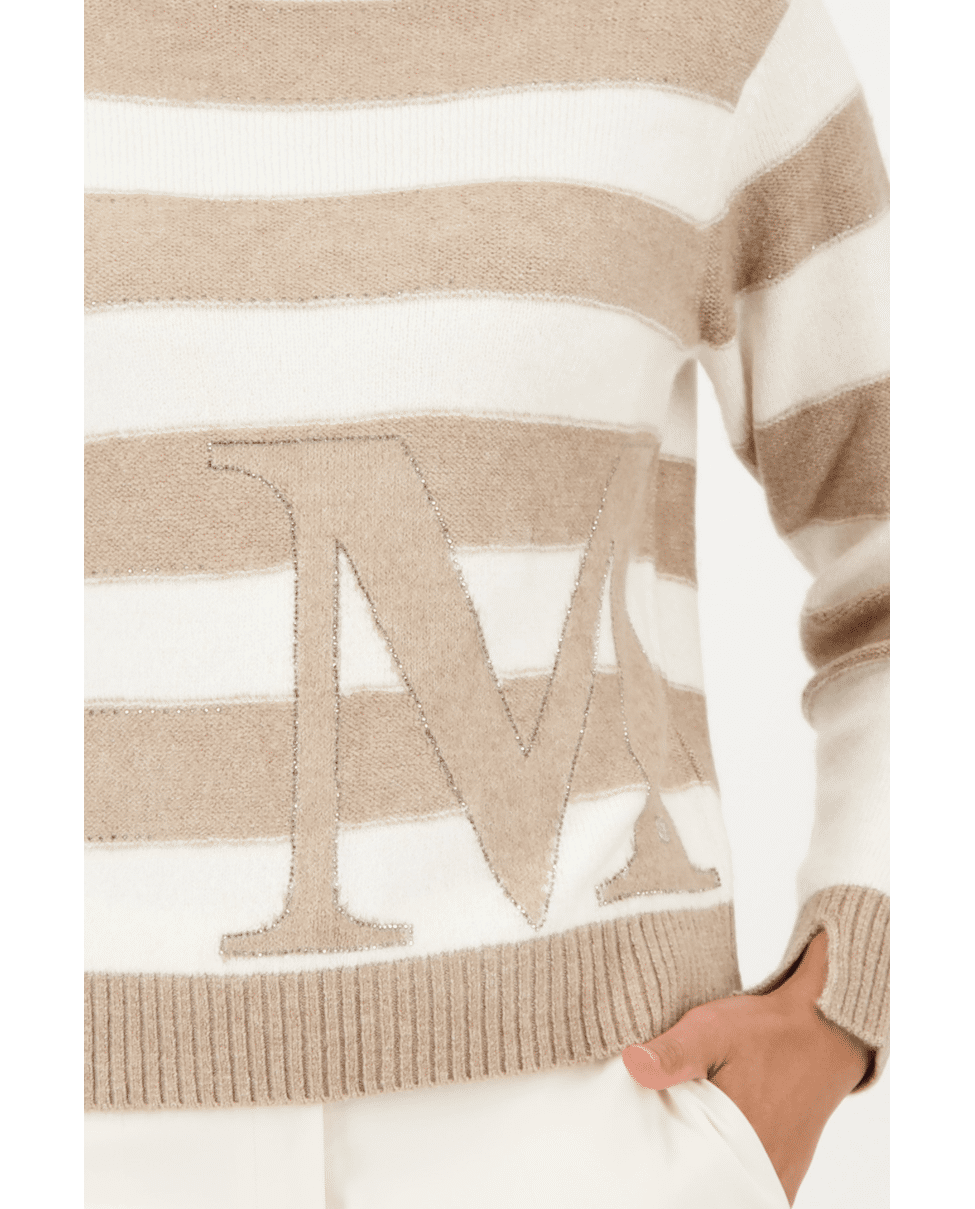 Deze gebreide trui met brede strepen en grote ‘M’-print is een echte blikvanger. Perfect voor casual dagen, met een comfortabele pasvorm en zachte feel.