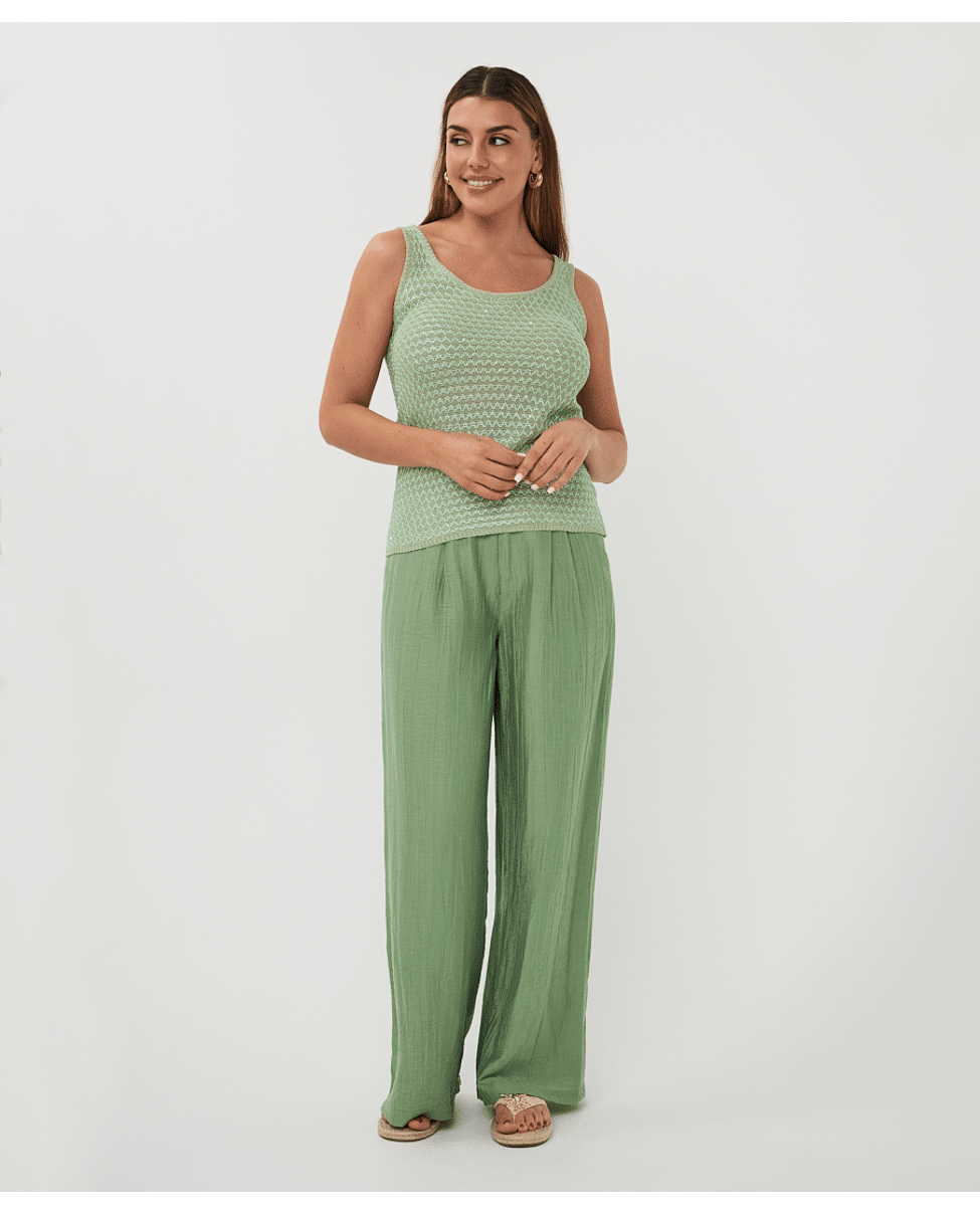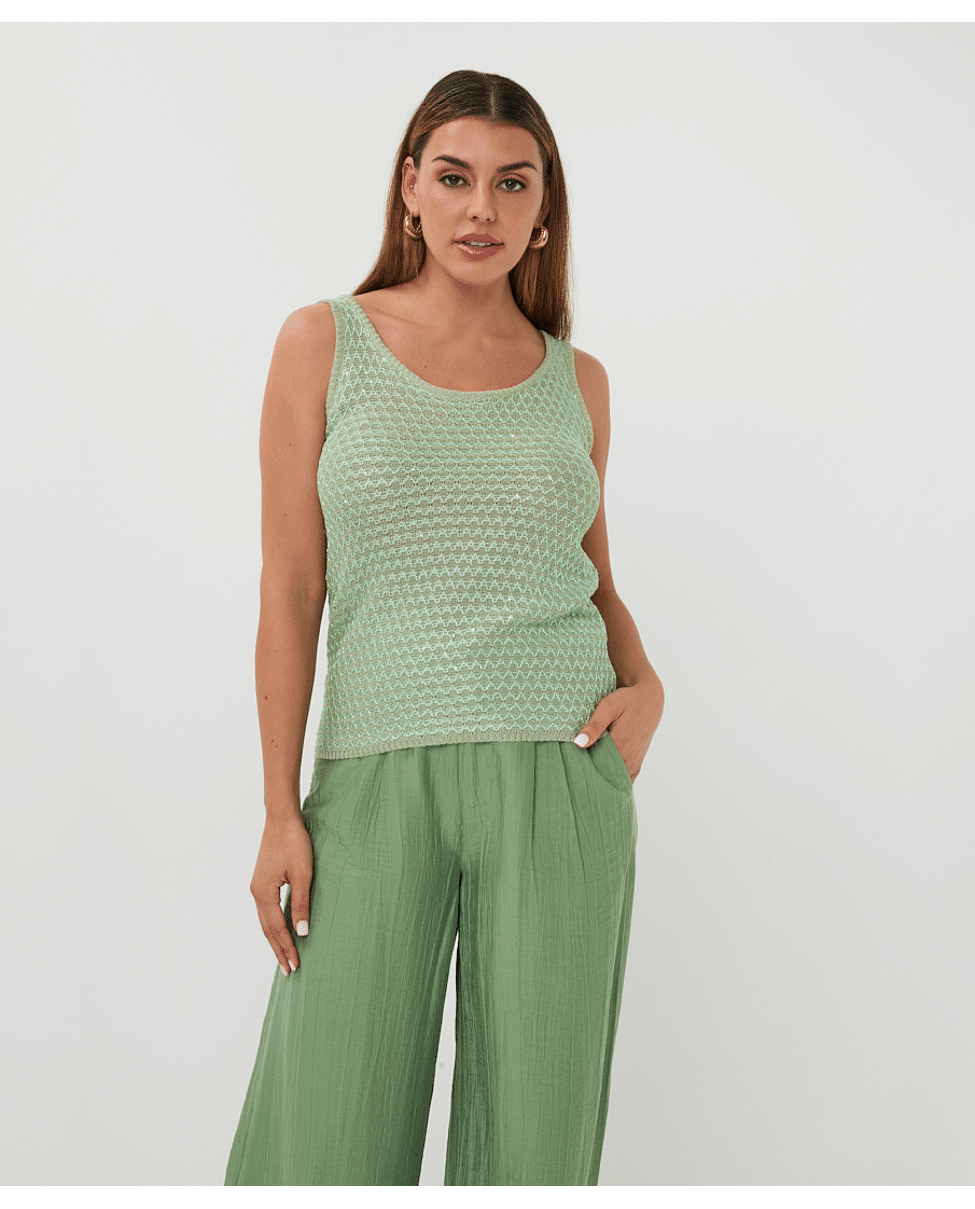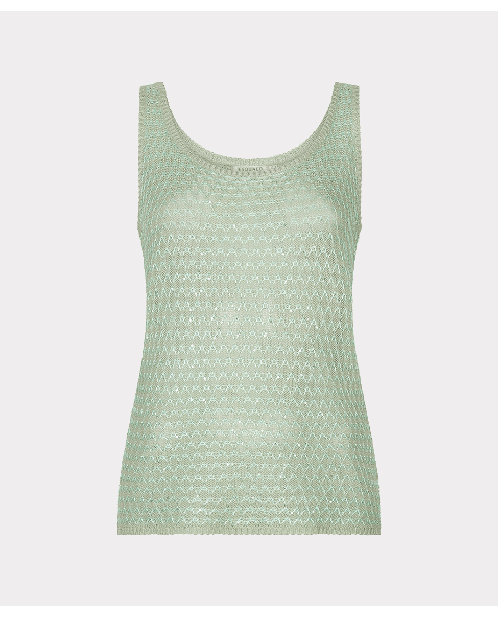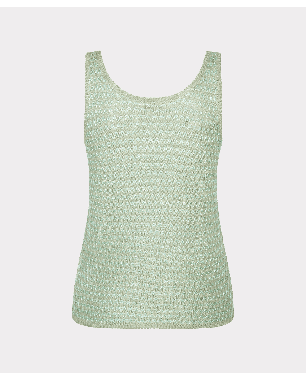 Deze luchtige knit singlet met pailletten in soft green is perfect voor zomerse avonden. De subtiele glans en open structuur geven een verfijnde, vrouwelijke uitstraling.