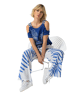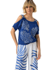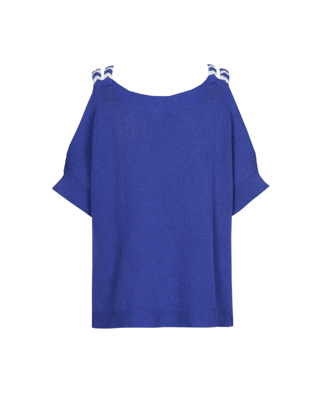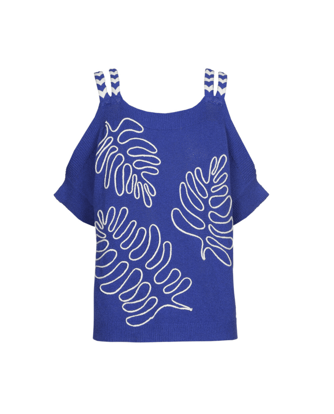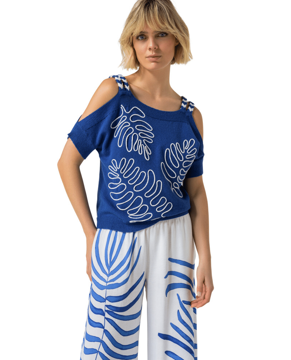 Deze blauwe fantasie trui met schouderdetail en borduursel geeft je outfit een frisse, zomerse uitstraling. Ideaal voor een casual dag of een stijlvolle city look.