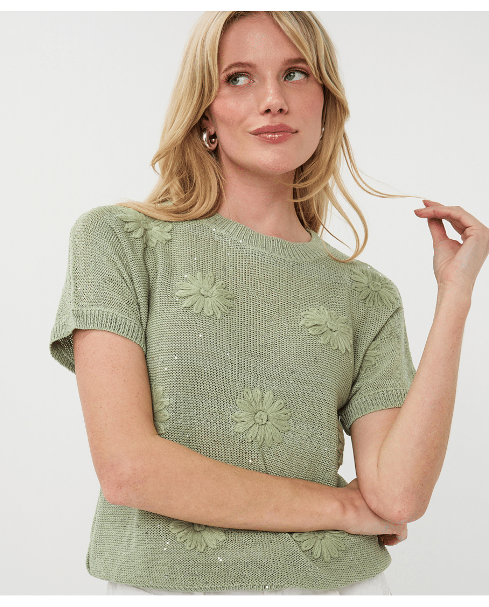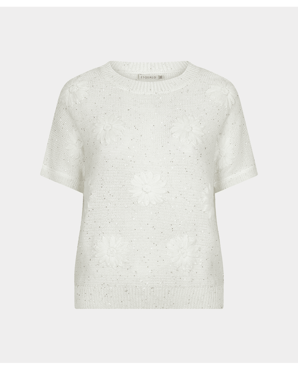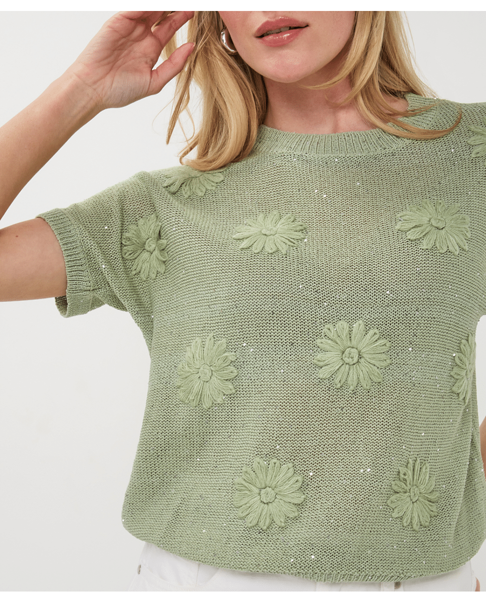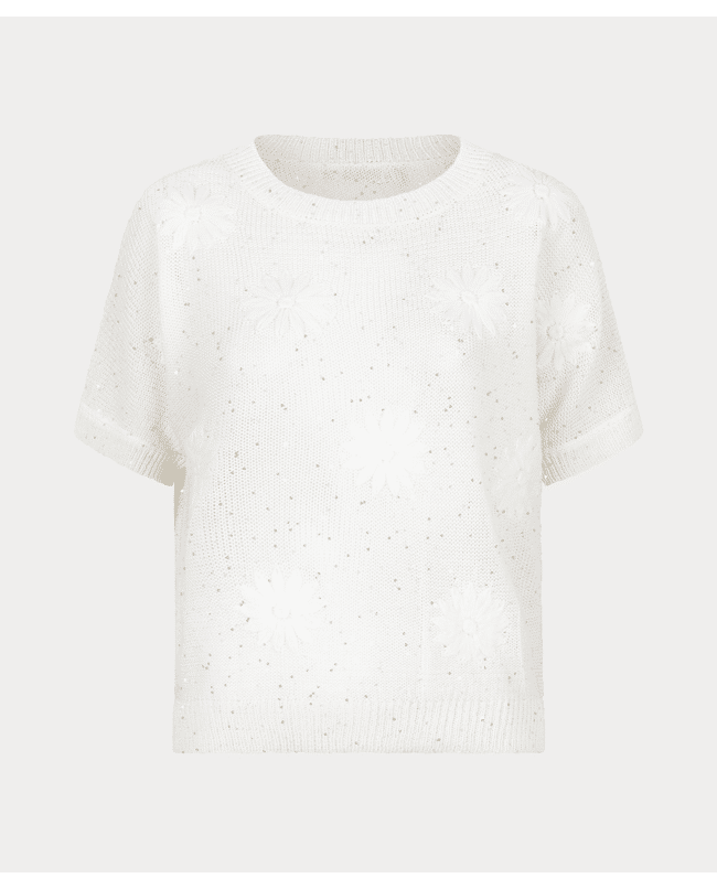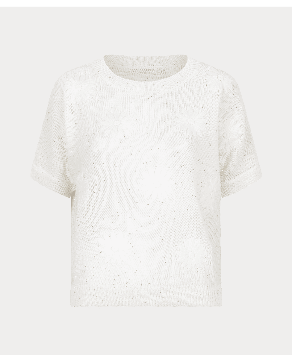 Deze gebreide zomertop met bloemborduursel brengt lichtheid en speelsheid samen. De subtiele glans en korte mouw maken ‘m ideaal voor frisse lentedagen of zwoele zomeravonden.