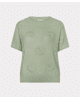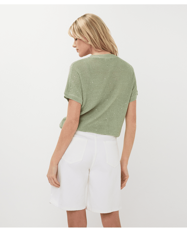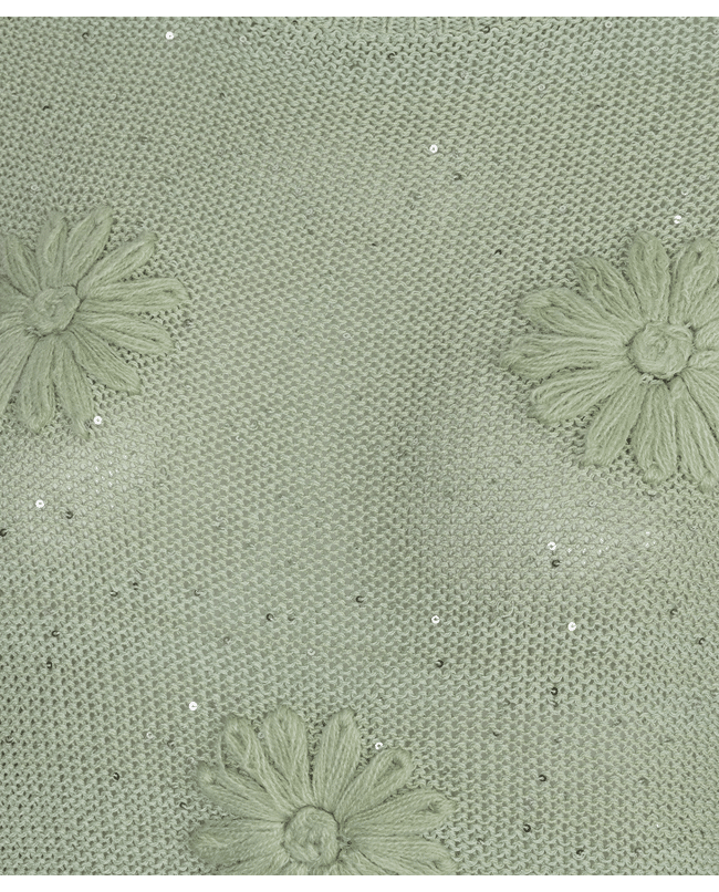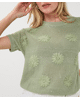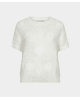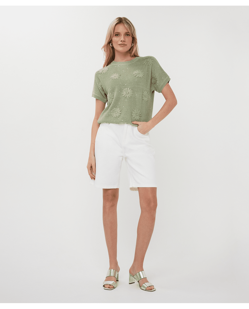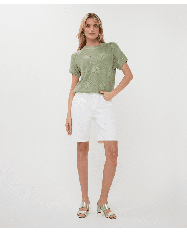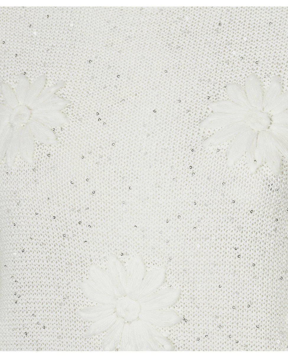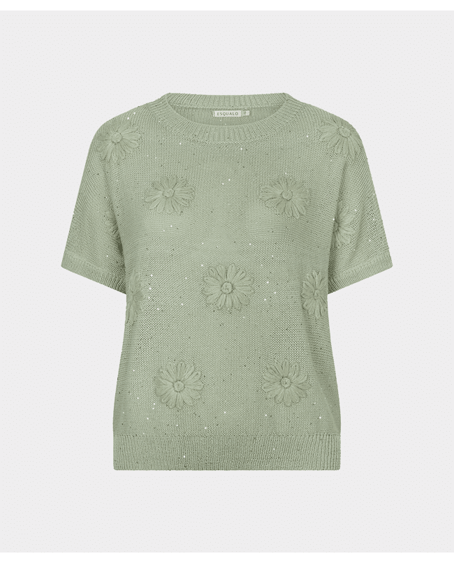 Deze gebreide zomertop met bloemborduursel brengt lichtheid en speelsheid samen. De subtiele glans en korte mouw maken ‘m ideaal voor frisse lentedagen of zwoele zomeravonden.