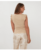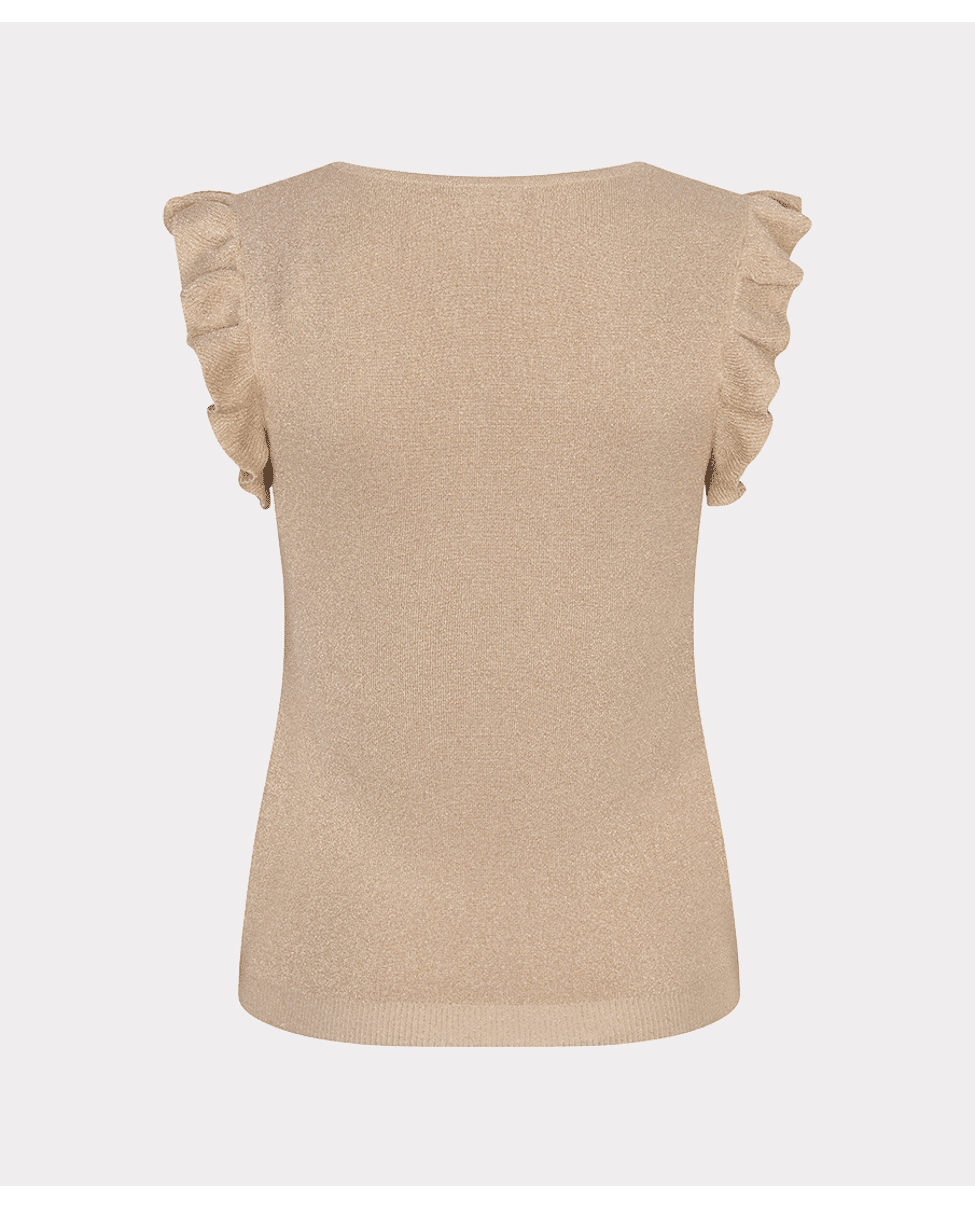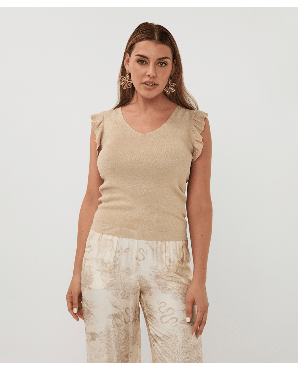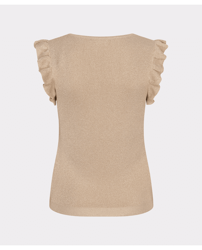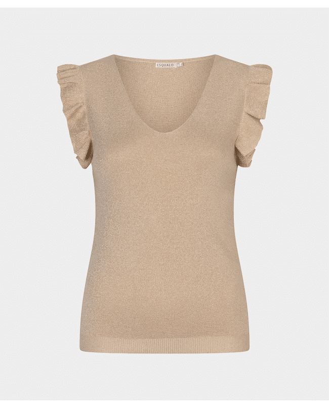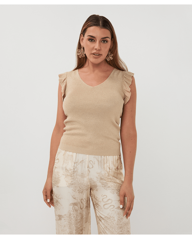 De subtiele glans en de speelse ruffle mouwen maken deze top nét even anders. Draagbaar van dag tot avond.