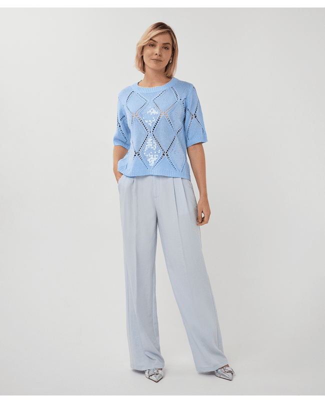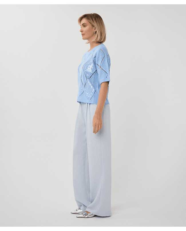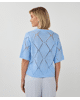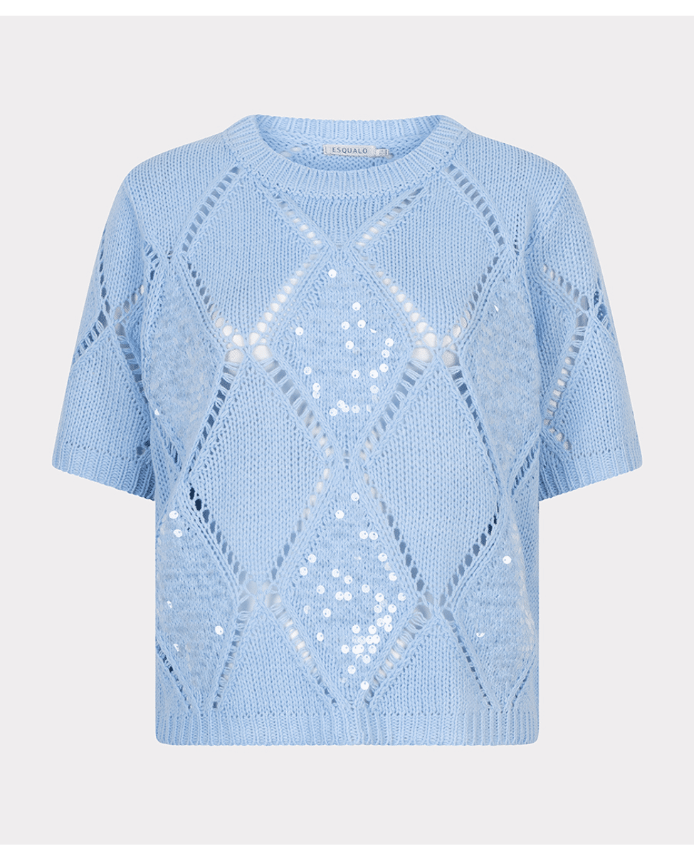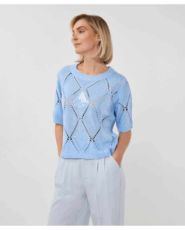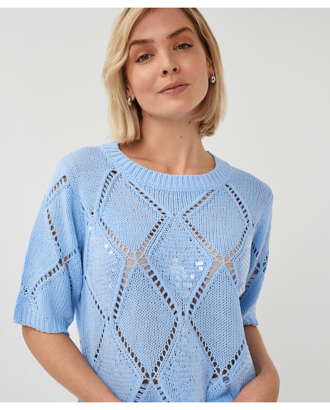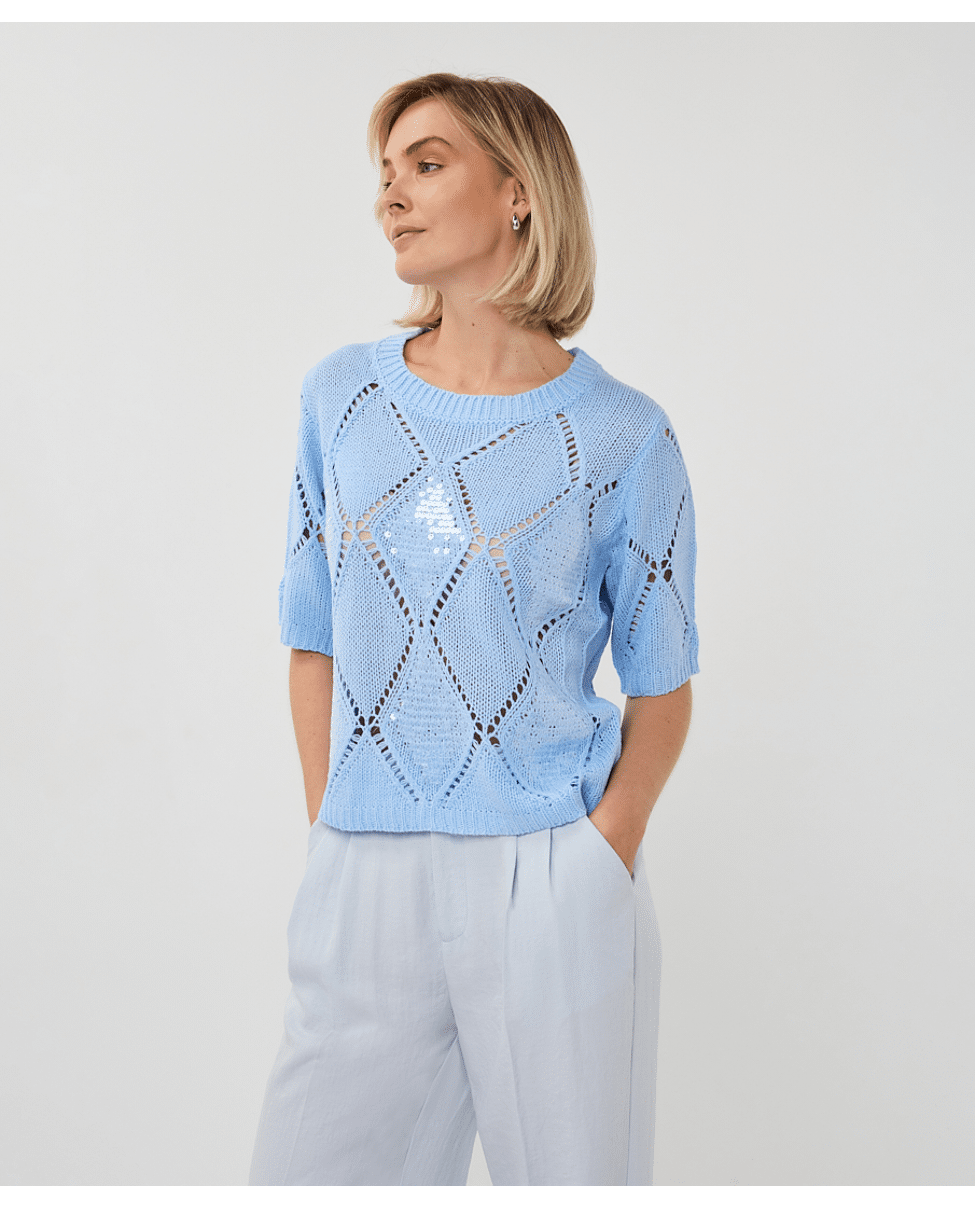 Een zomerse trui in Pacific Blue met een fijn ajourpatroon en subtiele pailletten. De opengewerkte diamantstructuur geeft deze sweater een luchtige en vrouwelijke uitstraling.