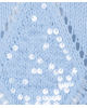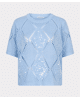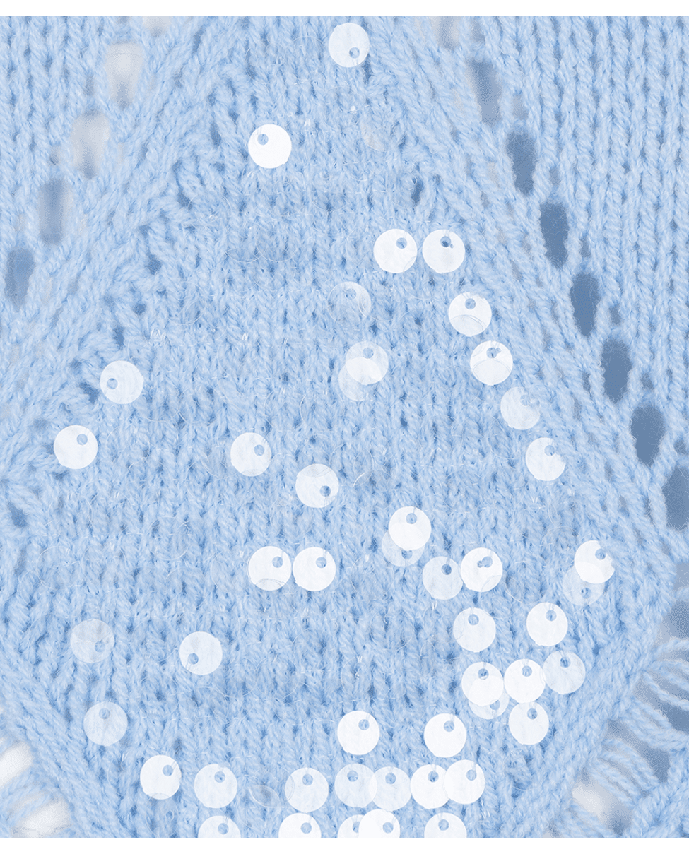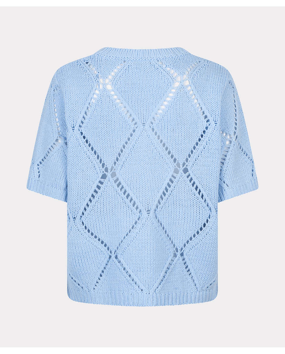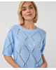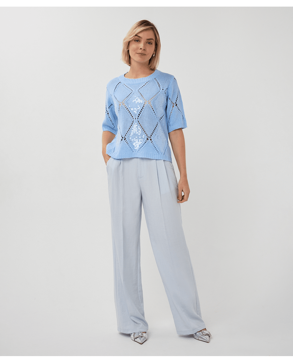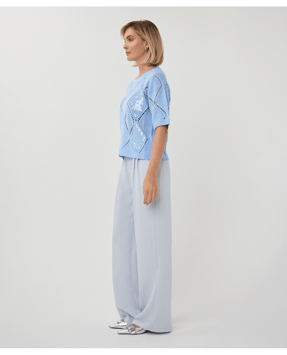 Een zomerse trui in Pacific Blue met een fijn ajourpatroon en subtiele pailletten. De opengewerkte diamantstructuur geeft deze sweater een luchtige en vrouwelijke uitstraling.