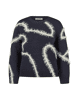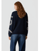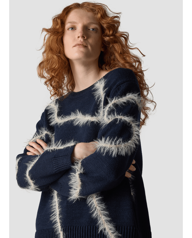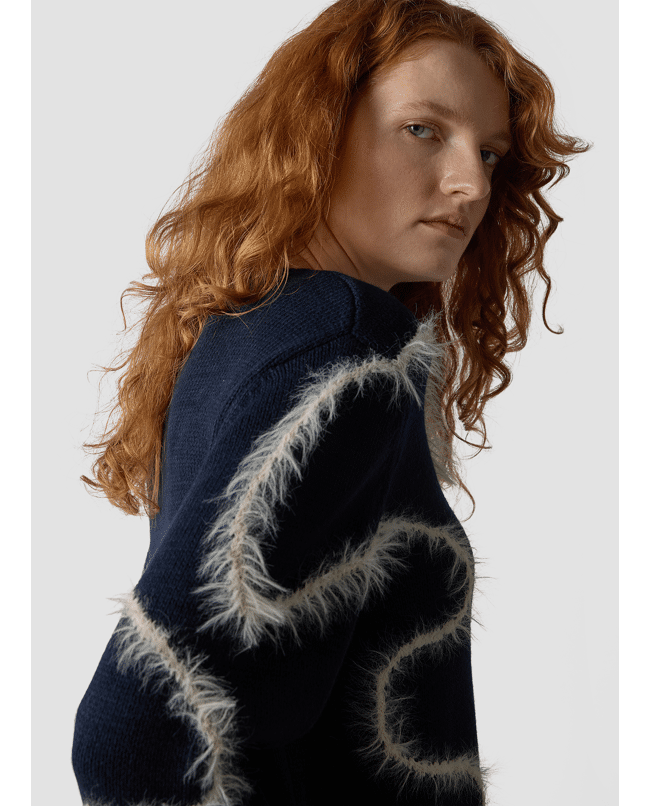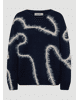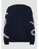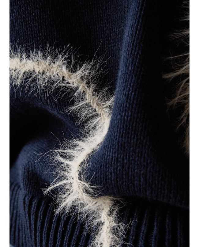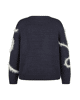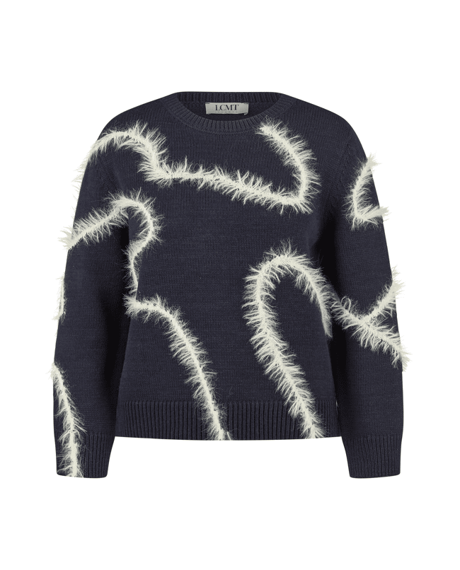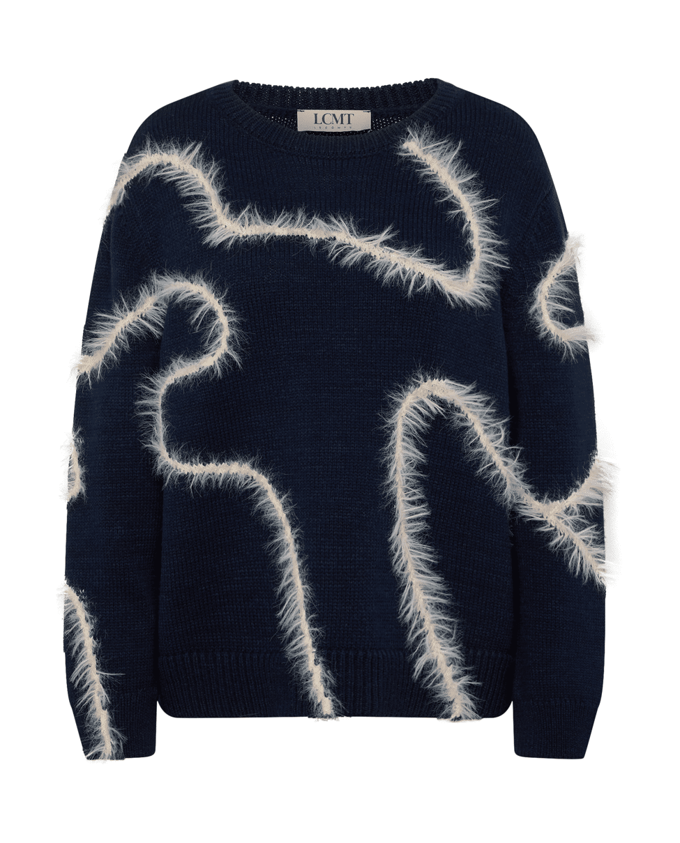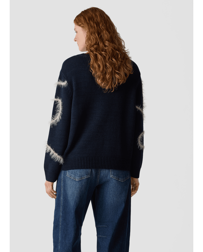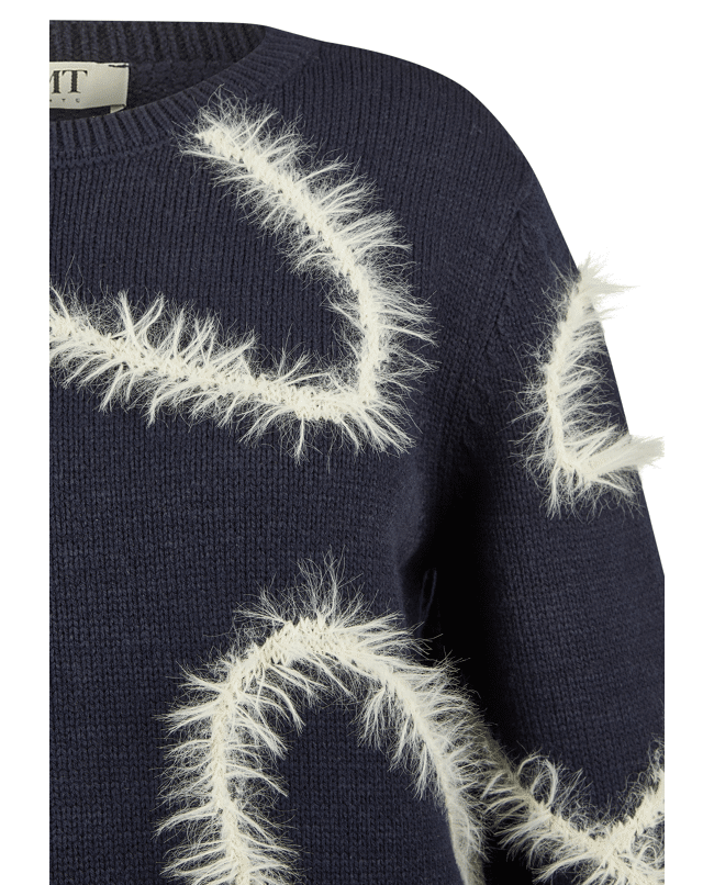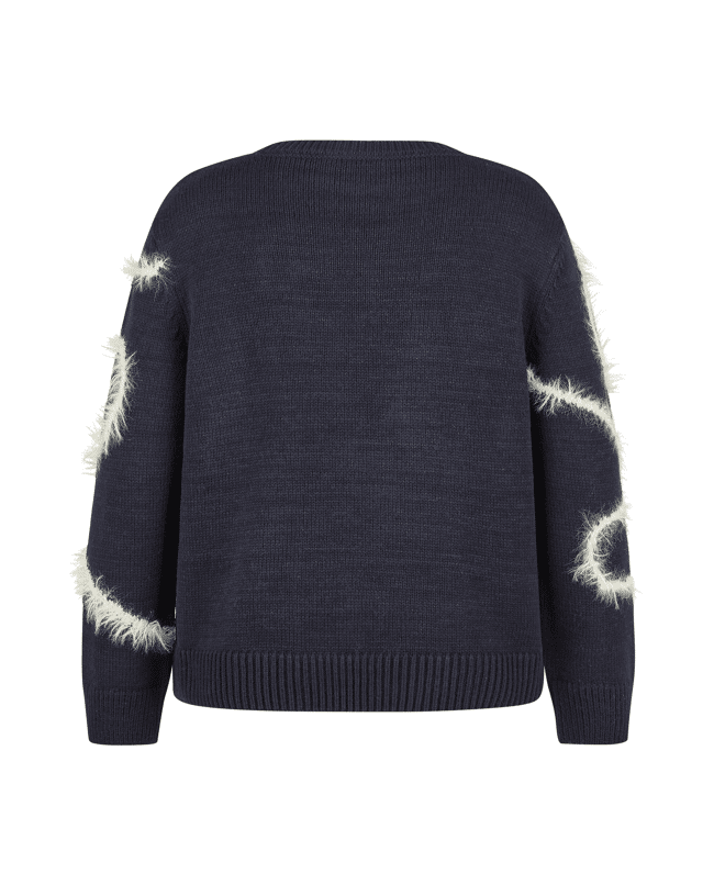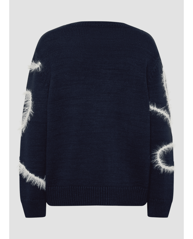 Een statement trui met een knipoog. Deze donkerblauwe gebreide trui is allesbehalve basic. De speelse, zachte accenten in contrasterend wit geven 'm een eigenzinnig karakter. Perfect voor wie warmte en stijl wil combineren.