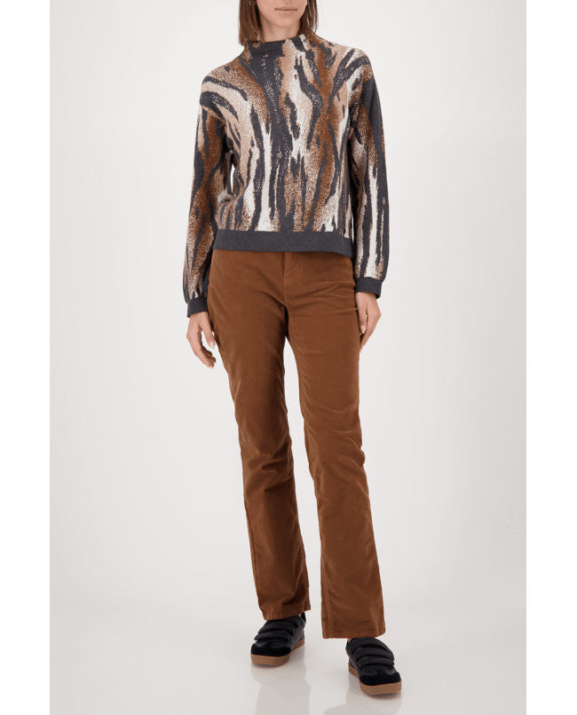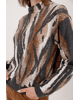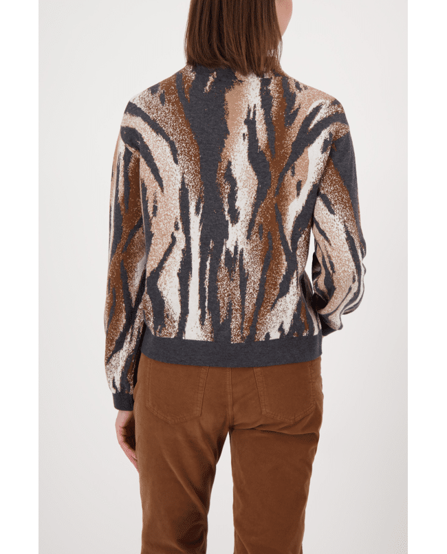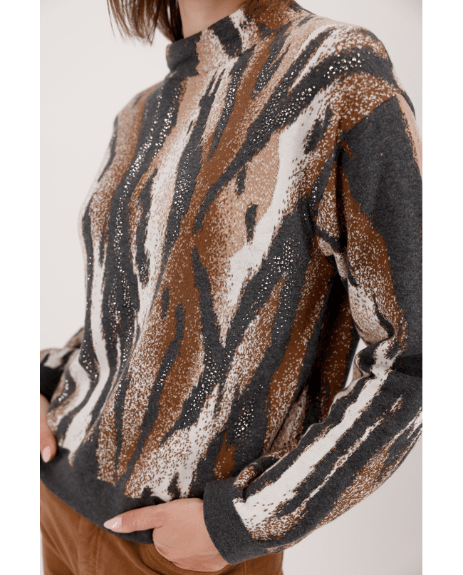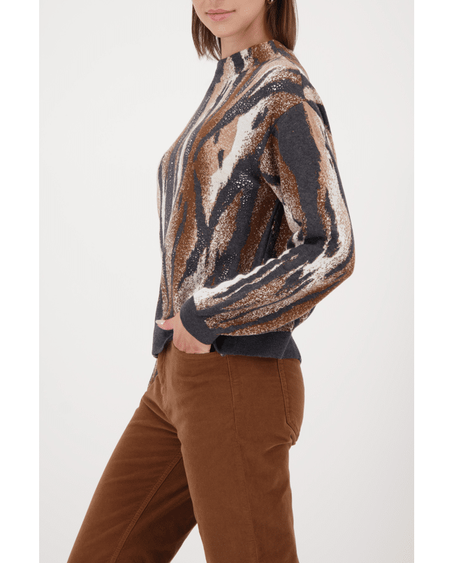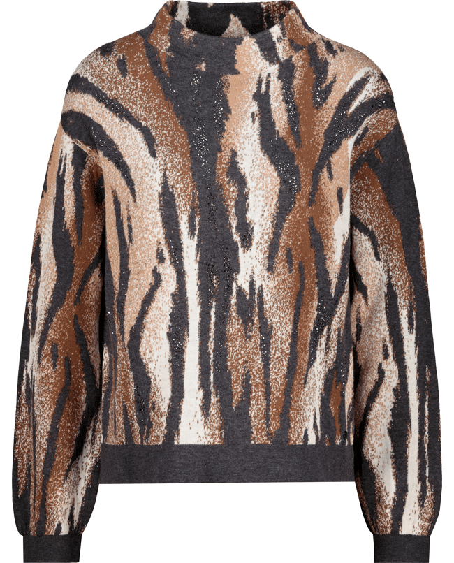 Gebreide damestrui van Monari met tijgerprint, strassteentjes, turtleneck en lange mouwen