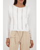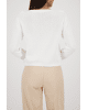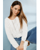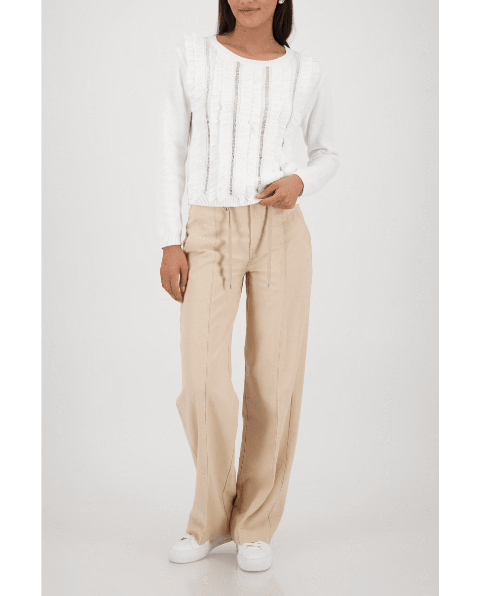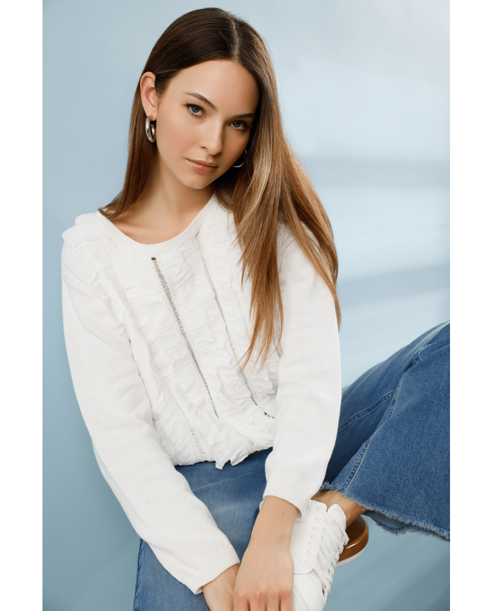 De verticale volants en opengewerkte stroken geven deze trui een luchtige, romantische uitstraling – perfect voor een casual-chique voorjaarsoutfit.