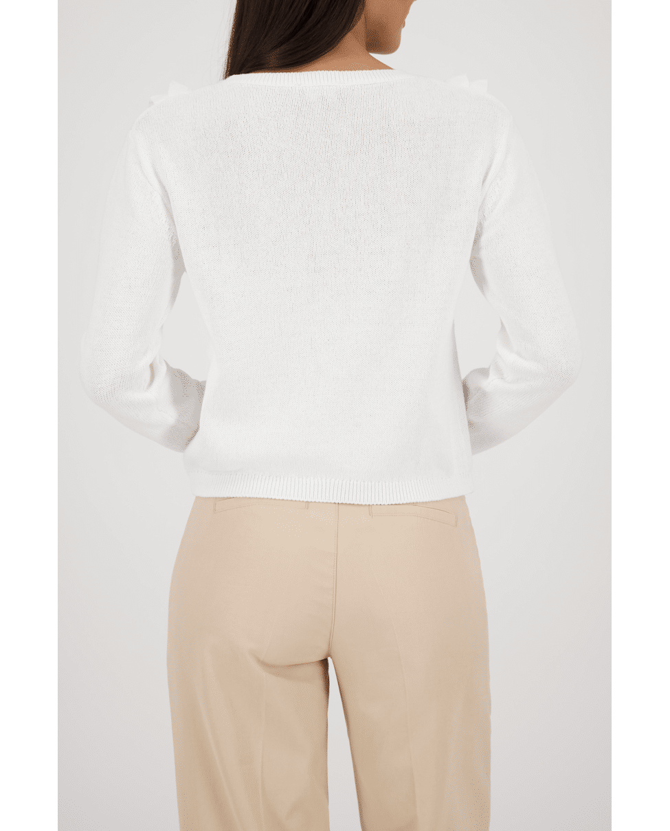 Vrouwelijke gebreide trui met speelse volants en transparante details. Ideaal voor een frisse lente-look met een elegante twist.