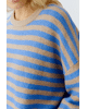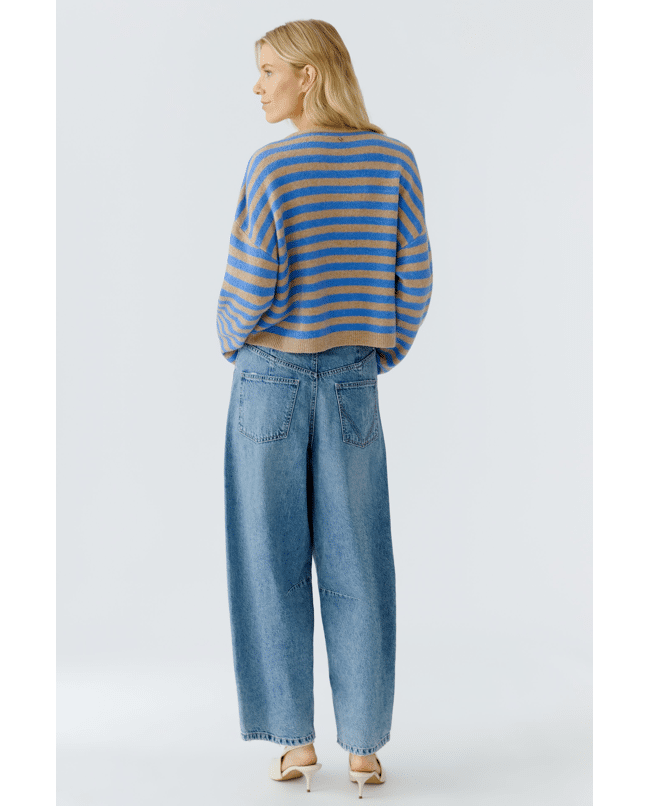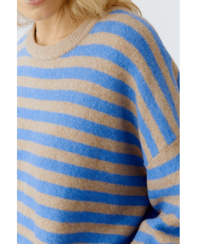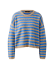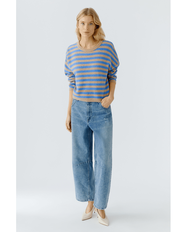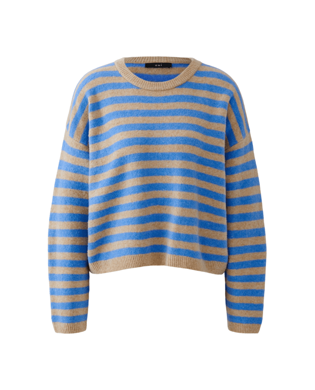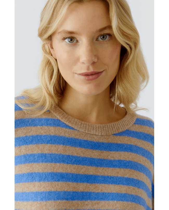 Deze gebreide pullover van Oui in camel blue is een warme knit met een modern streeppatroon. De ronde hals en lange mouwen maken dit een veelzijdige trui voor het najaar.