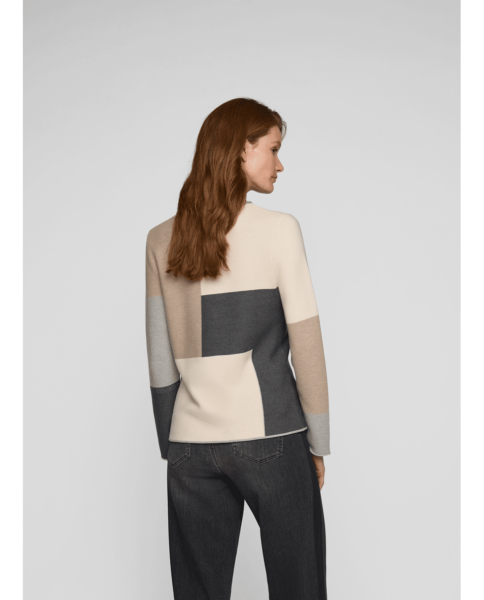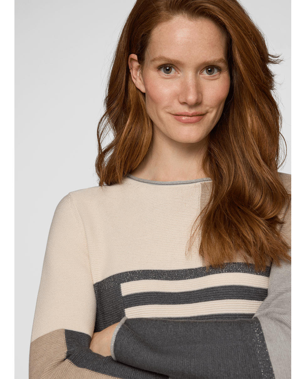 De kleurblokken en metallic touch geven deze trui karakter – comfortabel én verrassend stijlvol.