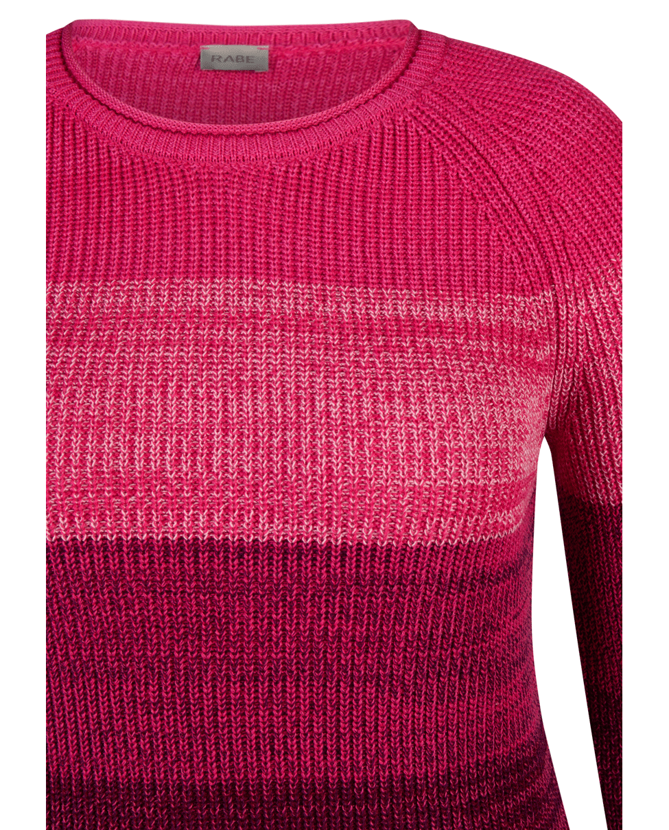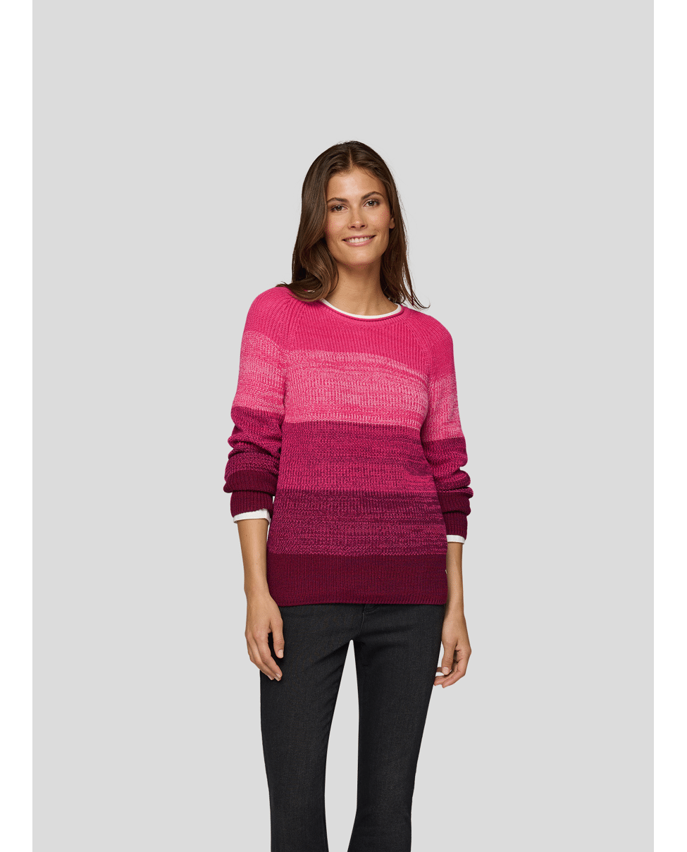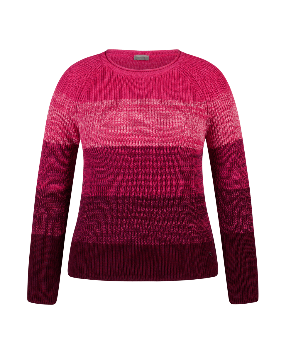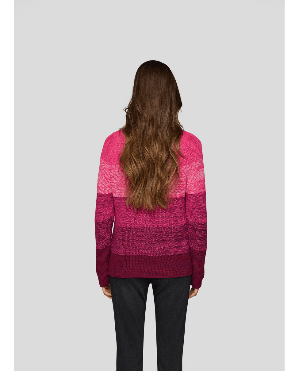 Een warme, gebreide trui van Rabe met een vrouwelijk kleurverloop in tinten violet en bordeaux. Ideaal voor frisse herfstdagen of knusse wintermomenten.