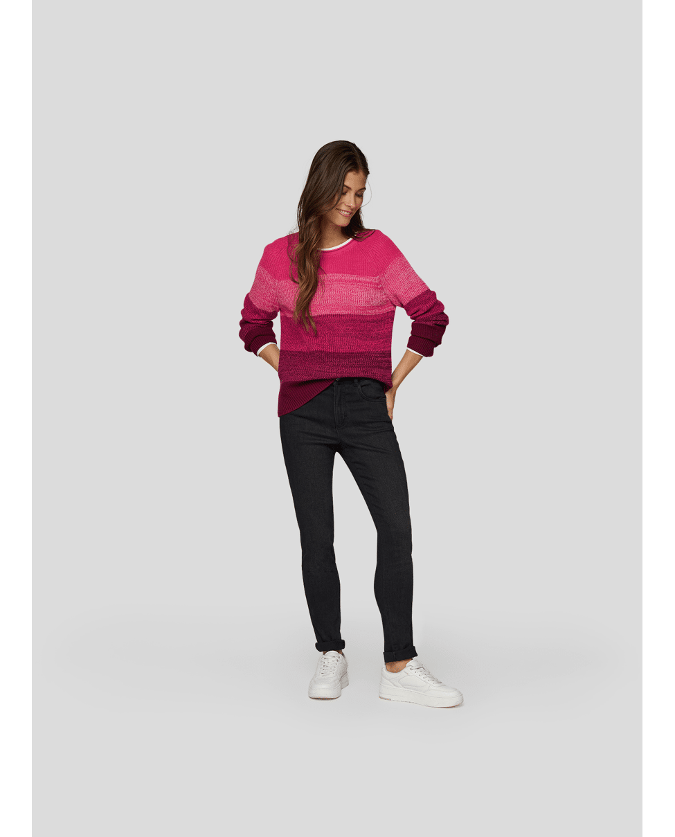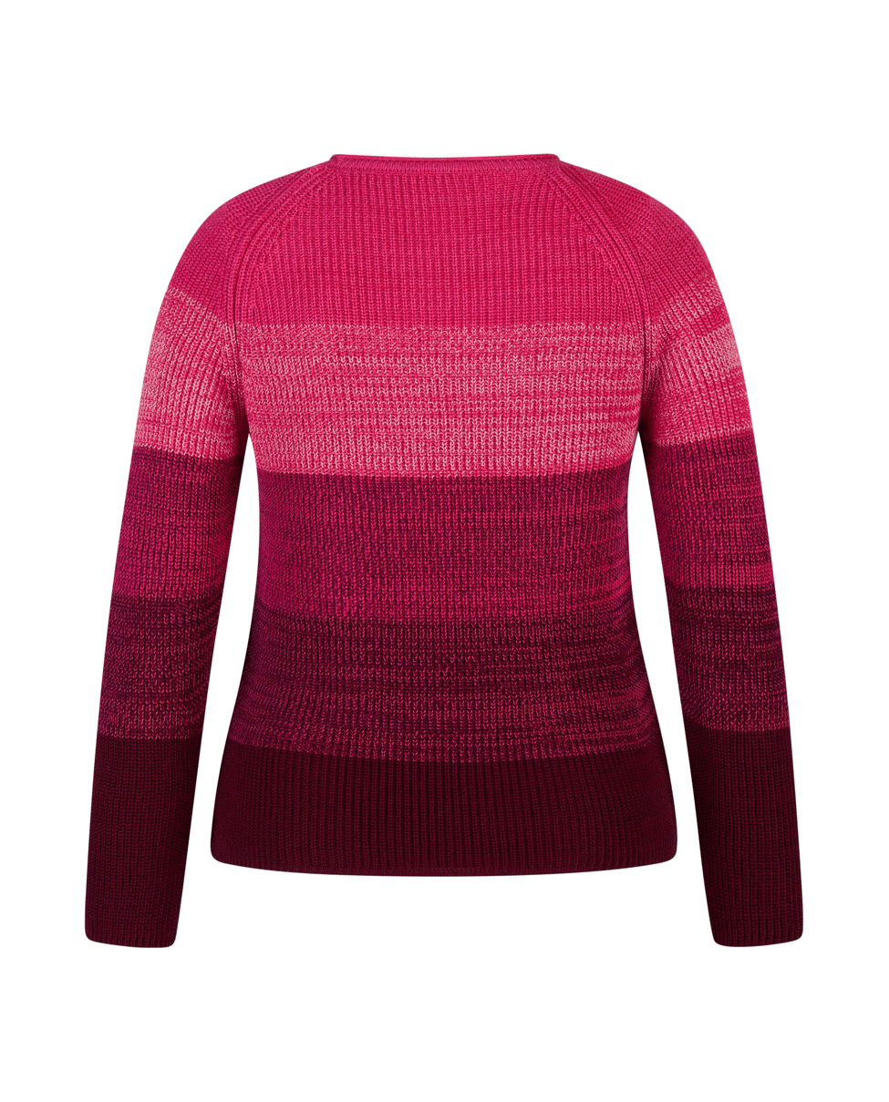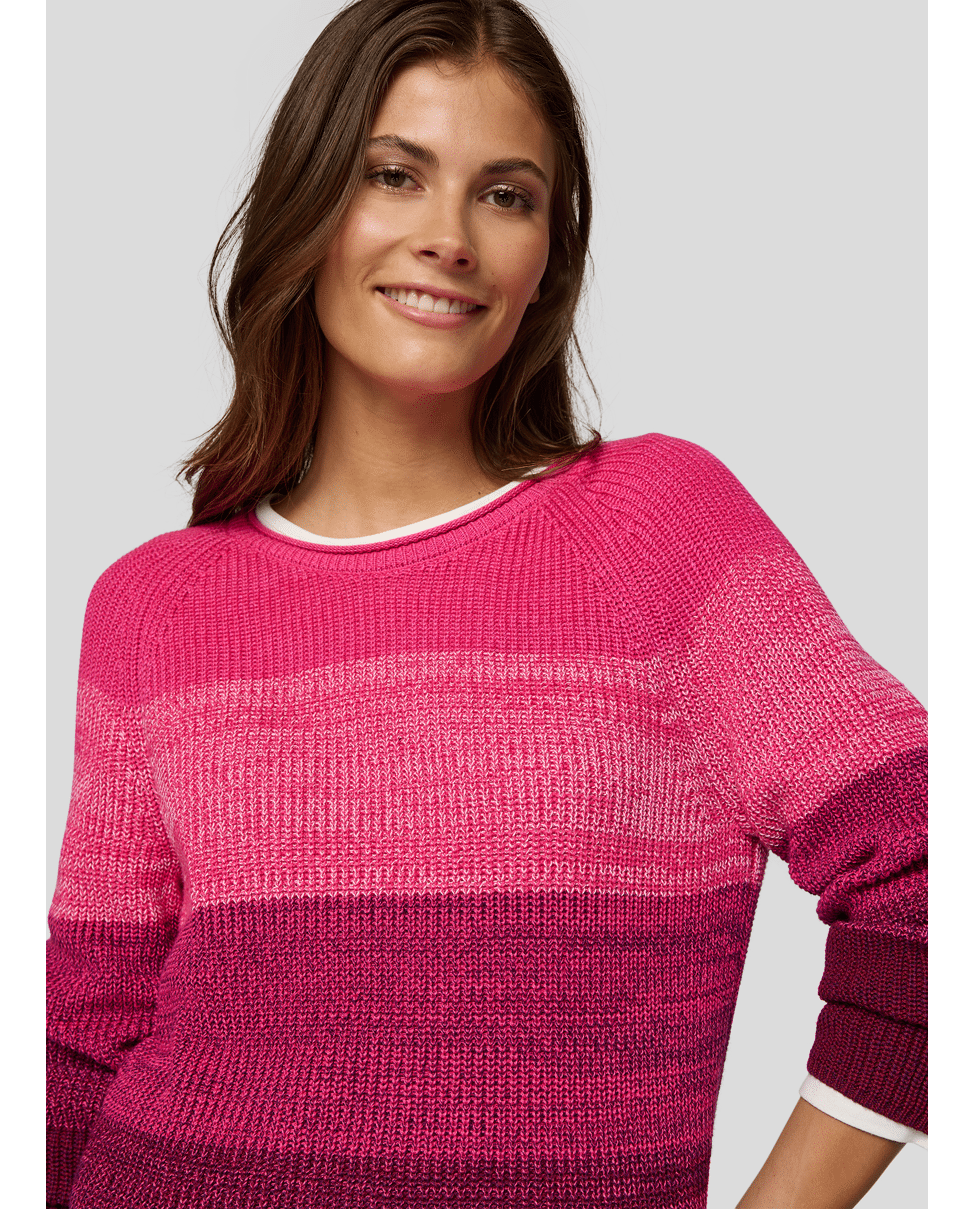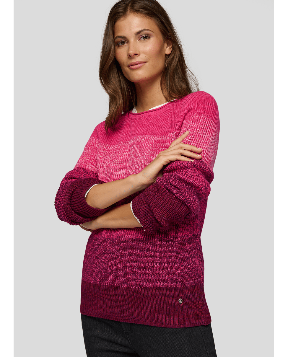 Een warme, gebreide trui van Rabe met een vrouwelijk kleurverloop in tinten violet en bordeaux. Ideaal voor frisse herfstdagen of knusse wintermomenten.