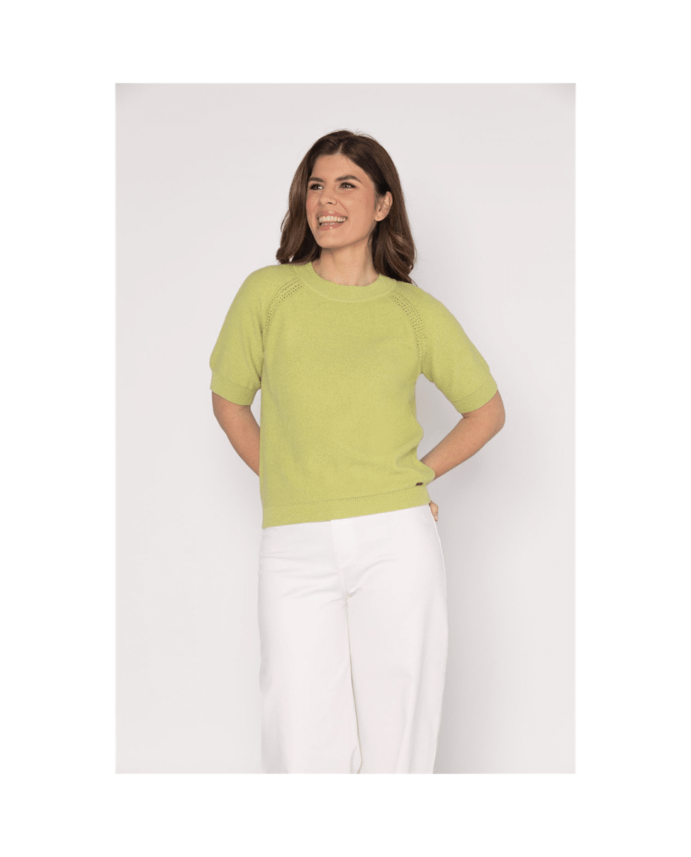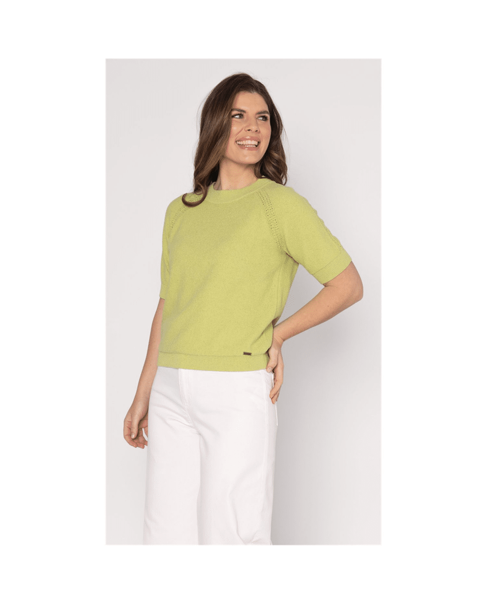 Zomers fijngebreid damestruitje met ronde hals en korte raglanmouwen van Roberto Sarto. De frisse spring green kleur geeft je outfit direct een lichte, eigentijdse uitstraling. Perfect voor een stijlvolle lente- of zomerdag, casual chic gecombineerd met een pantalon of rok.