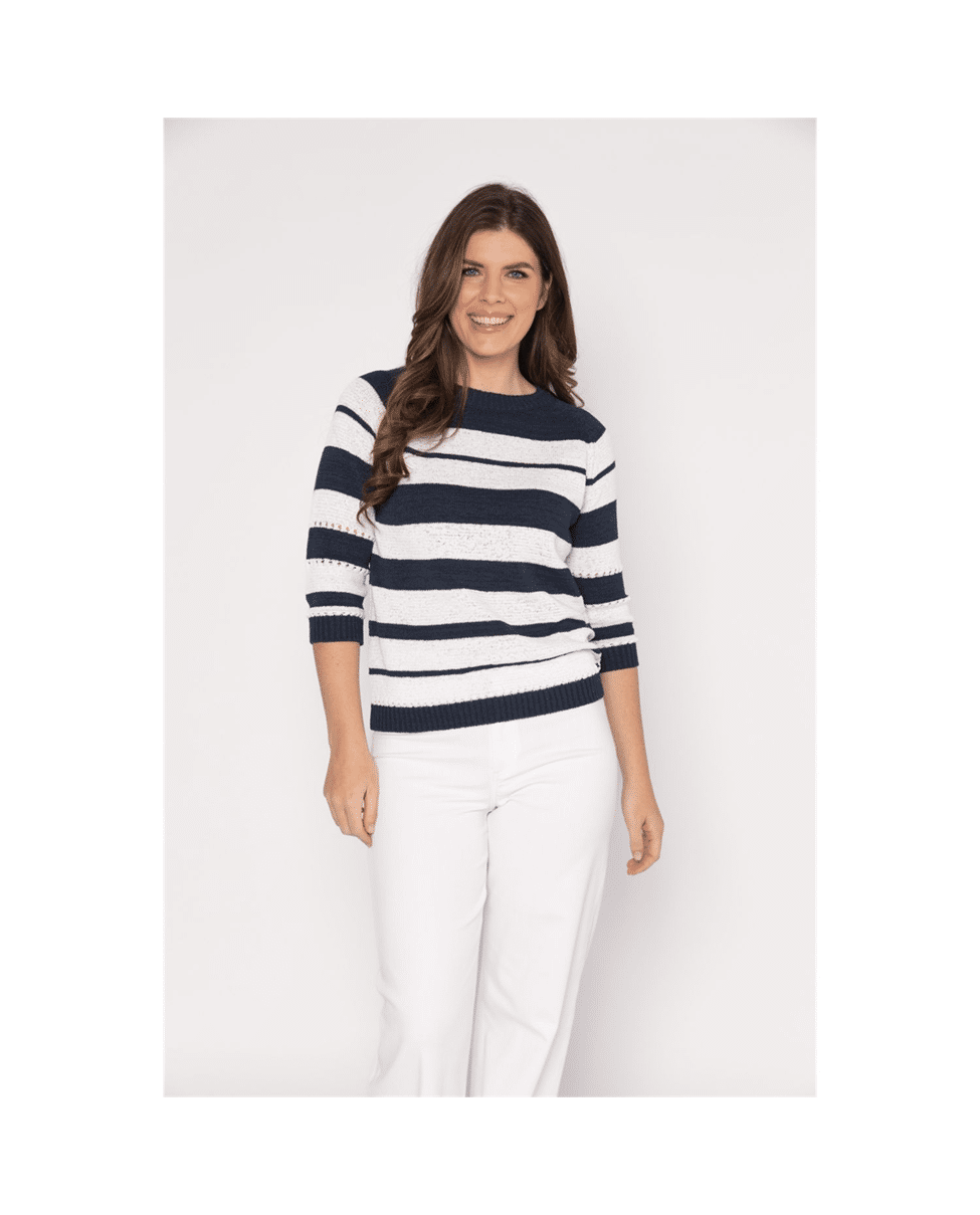Fijngebreide dames trui met ronde hals. De ¾ raglanmouwen en het bandjesgaren geven deze pullover een luchtige, zomerse uitstraling. Ideaal voor een casual voorjaarslook of frisse zomeravond.