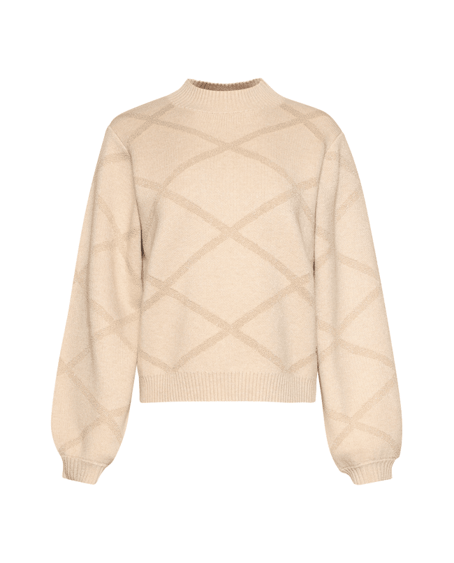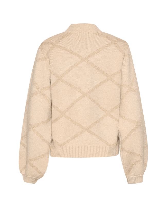Een zachte gebreide trui met tijdloos ruitpatroon in warme, neutrale tinten. Ideaal voor een comfortabele maar verzorgde look op frisse dagen.