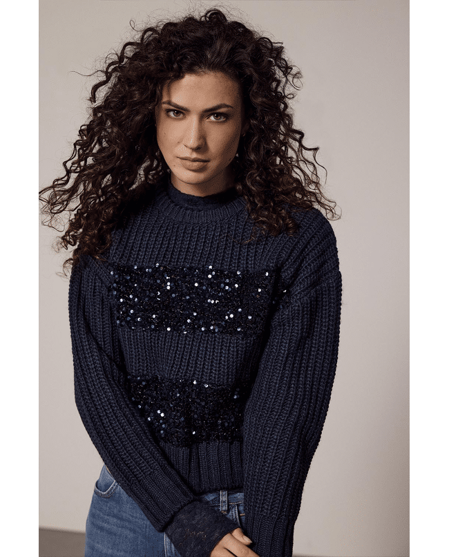 Een klassieke streep met een feestelijke twist. Deze trui in middernachtblauw combineert zachte wolmix met subtiele pailletten — voor dagen waarop je net iets meer wilt.De diepe midnight kleur zorgt voor een tijdloze, elegante basis die gemakkelijk te combineren is met verschillende outfits.
