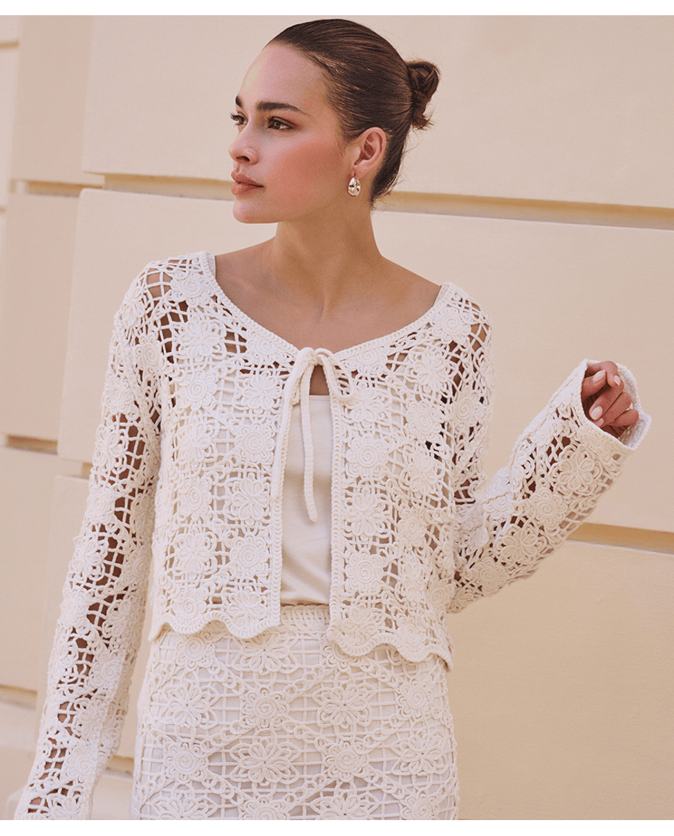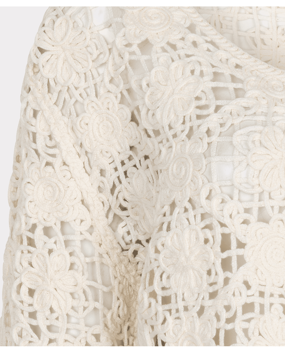 De verfijnde haakstructuur en het korte model geven een bohemian touch aan elke zomerlook. Mooi over een top of jurk.