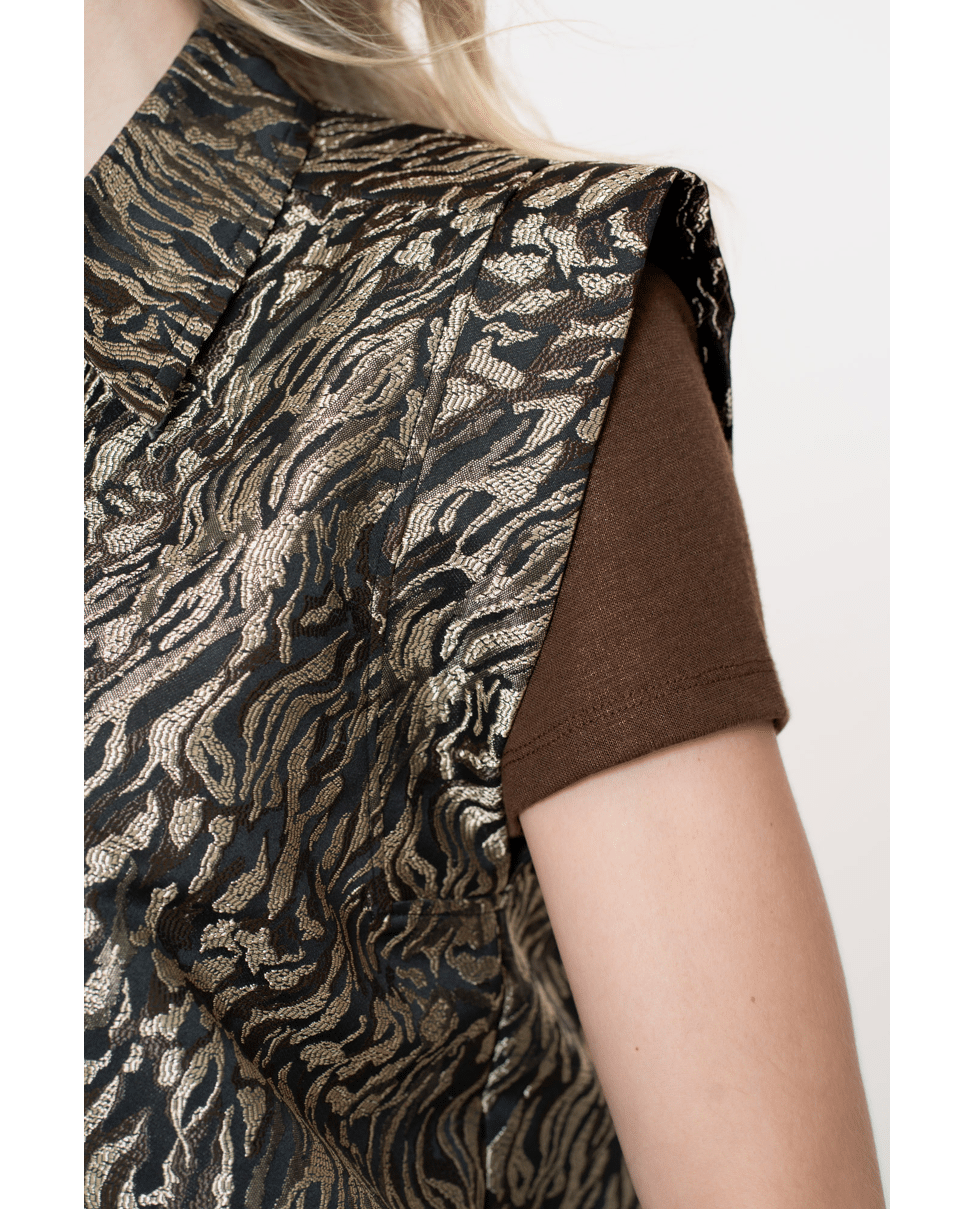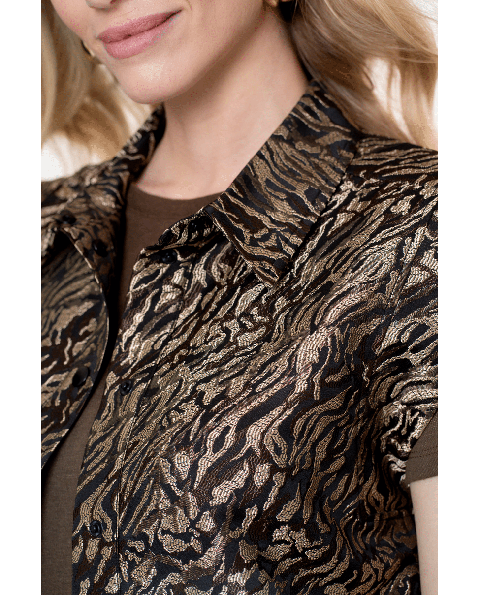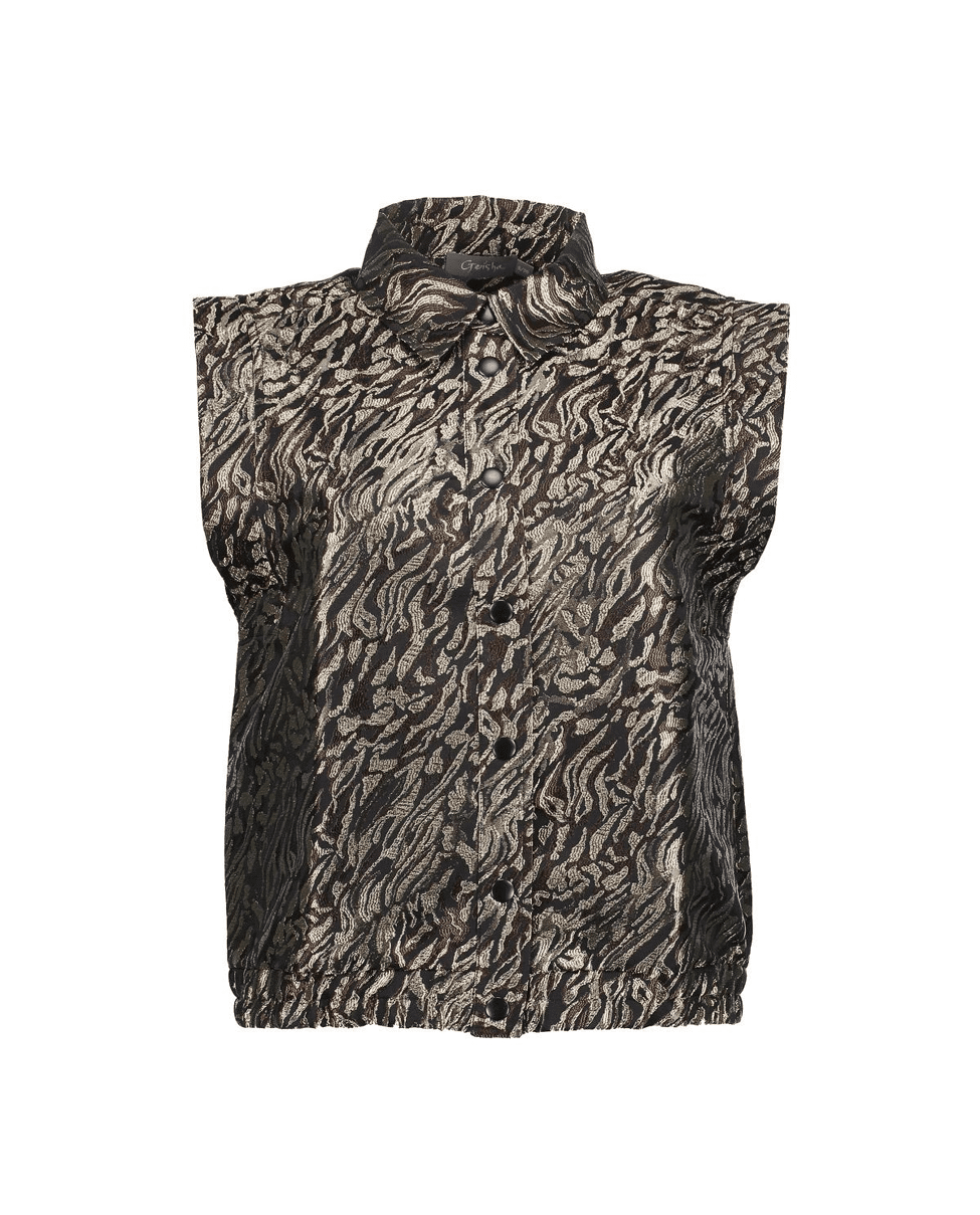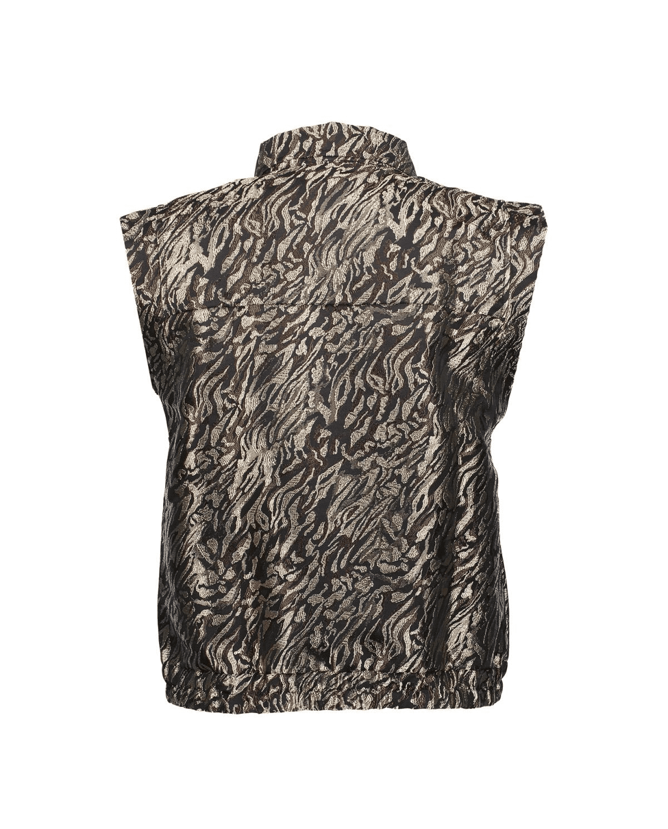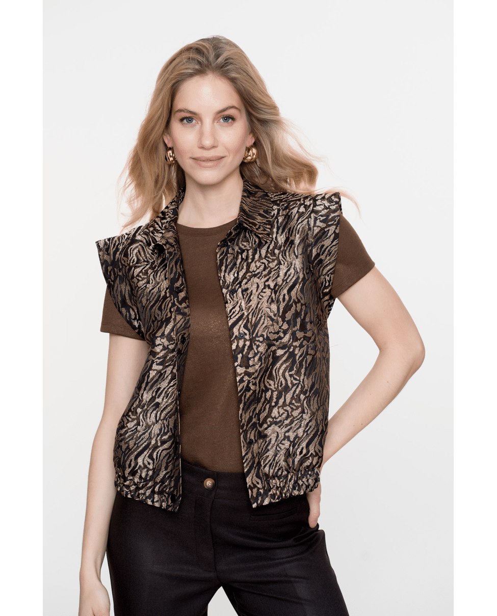 Damesgilet van Geisha met glanzende animalprint, kapmouwtje, klassieke kraak en knoopsluiting