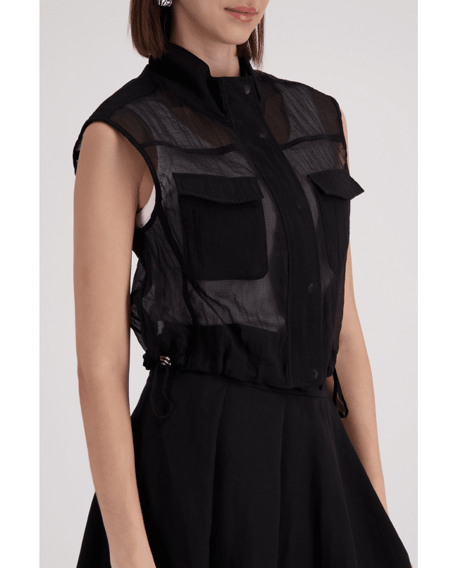 De transparante mesh en utility-details zorgen voor een stoere, maar verfijnde uitstraling.
