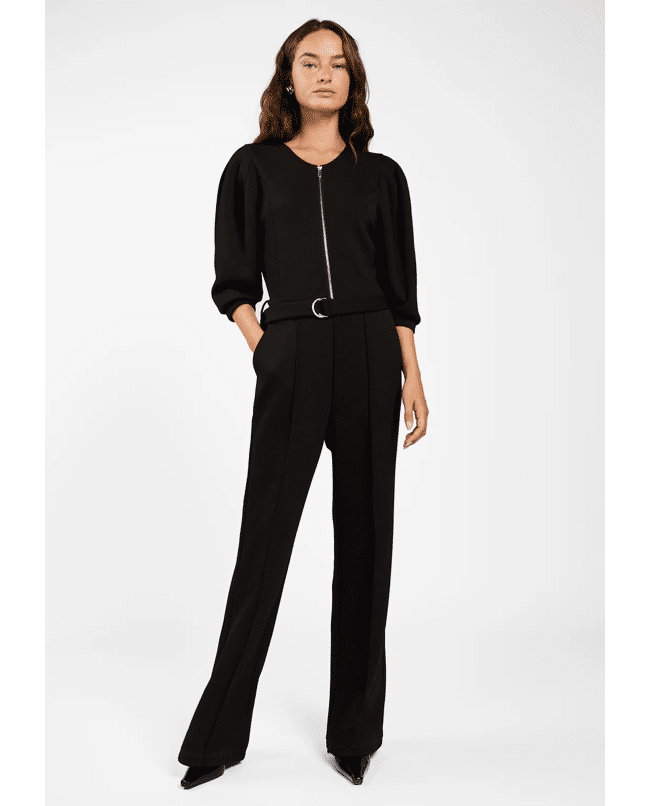 De rechte pijpen en de tailleceintuur zorgen voor een elegante silhouet. De rits maakt het net even stoerder.