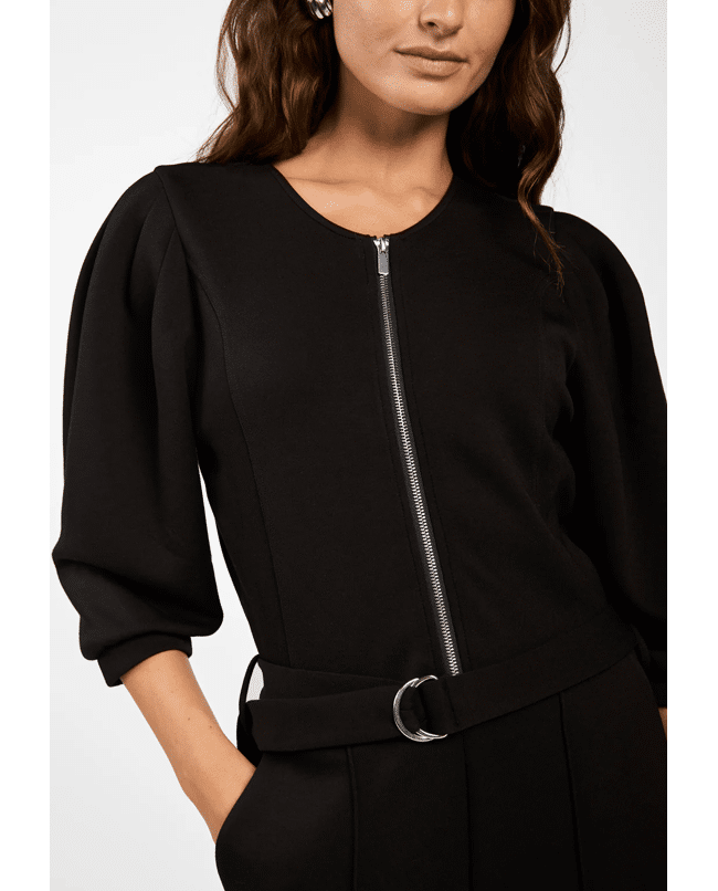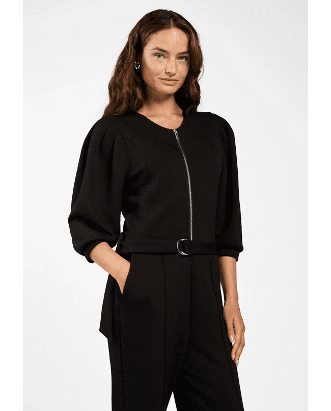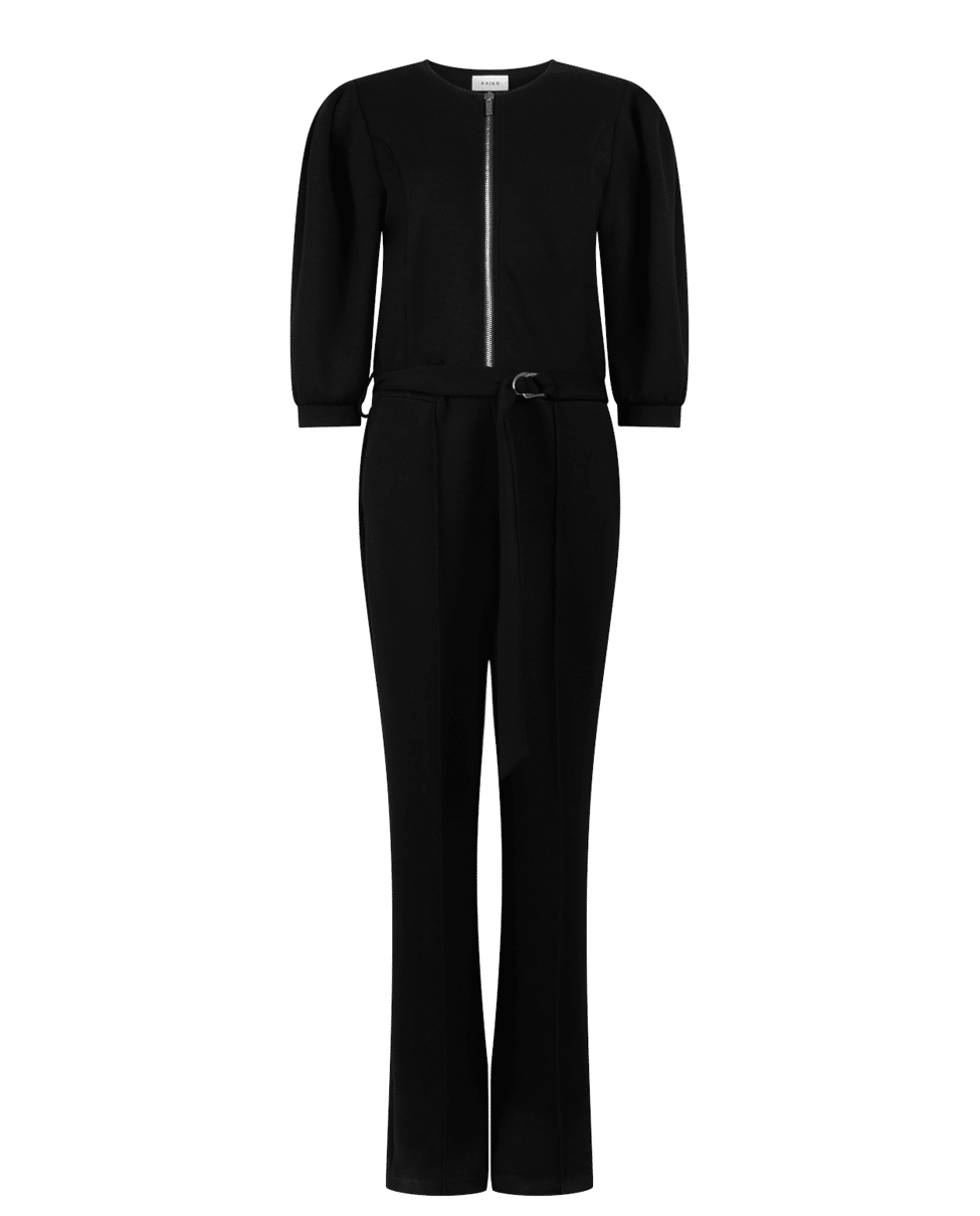 Deze zwarte jumpsuit is een stijlvol alternatief voor de klassieke avondjurk. Met een flatterende taille en moderne ritsdetails ben je in één keer gekleed. De zilverkleurige rits en strikceintuur geven een modern accent.