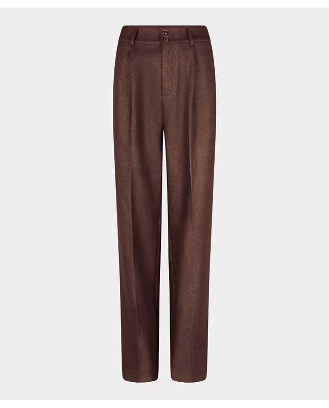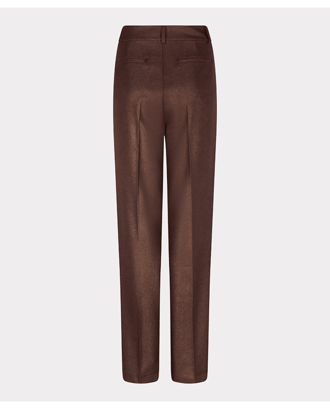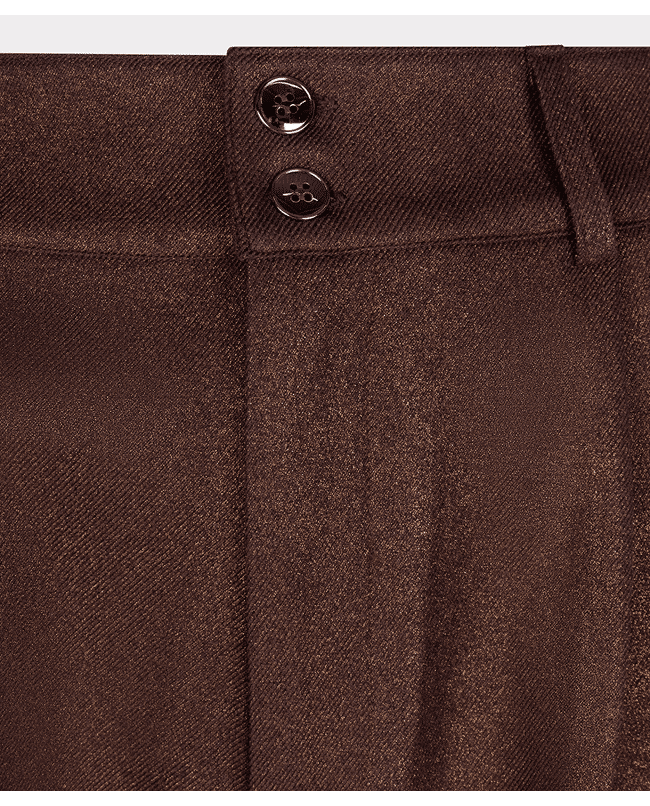 Deze glanzende broek in chocoladebruin is een stijlvol alternatief voor zwart. De plooien en zachte twillstof geven 'm een vrouwelijke, geklede uitstraling.