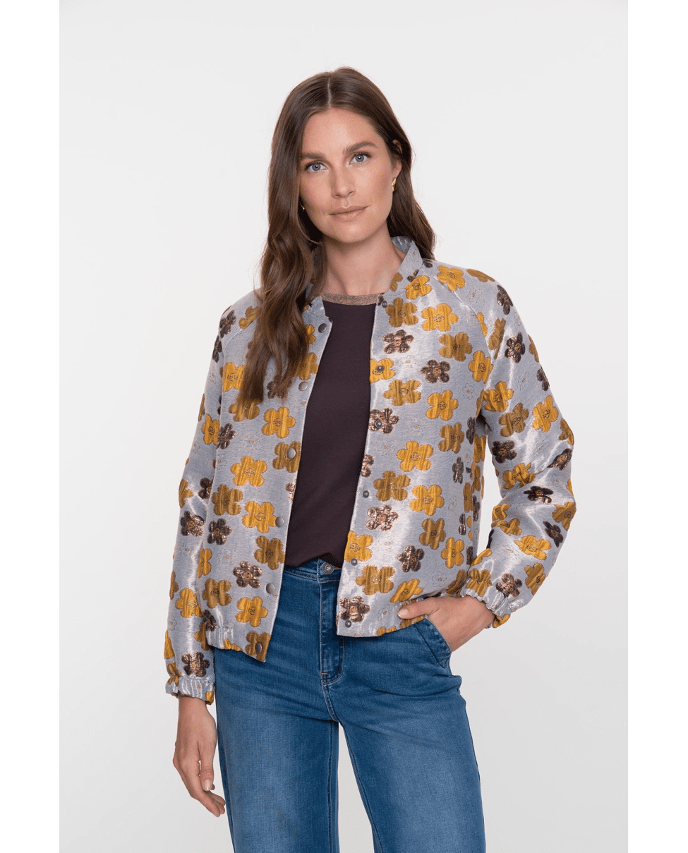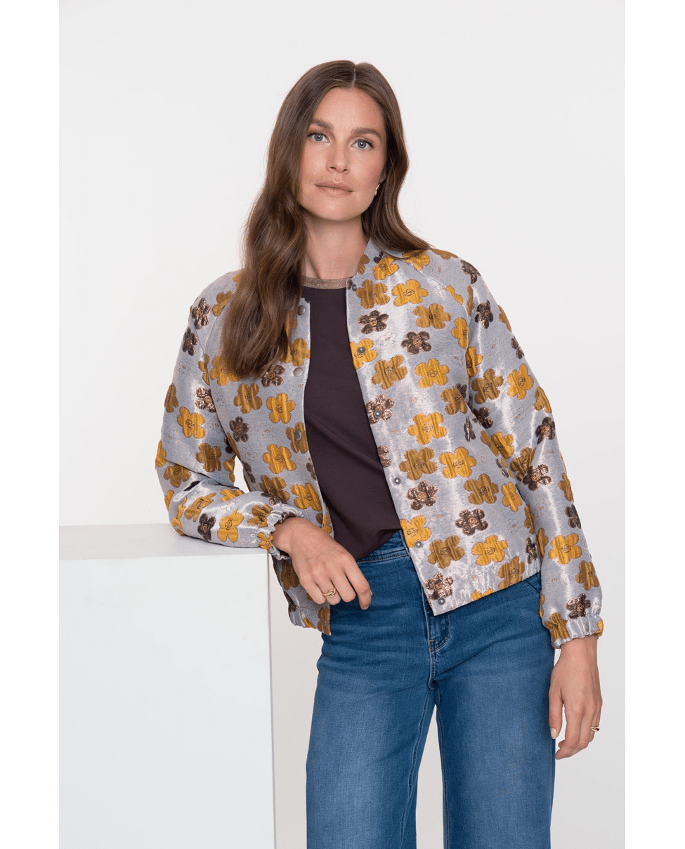 Op zoek naar een eyecatcher voor het najaar? Dit korte jasje in grijs met gele bloemenprint brengt flair en fun in elke outfit. Perfect voor bijzondere gelegenheden of gewoon, omdat het kan.