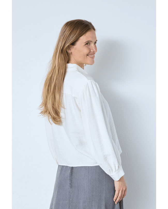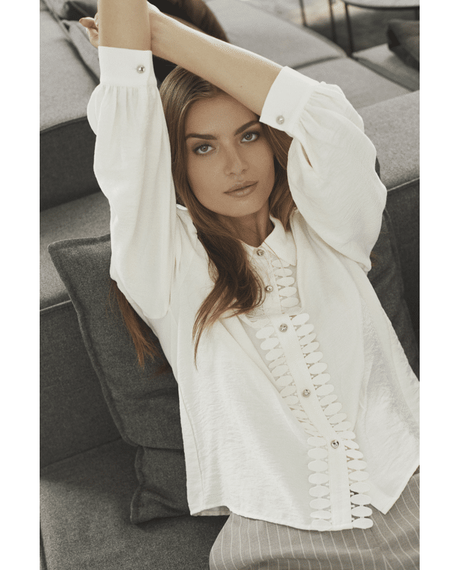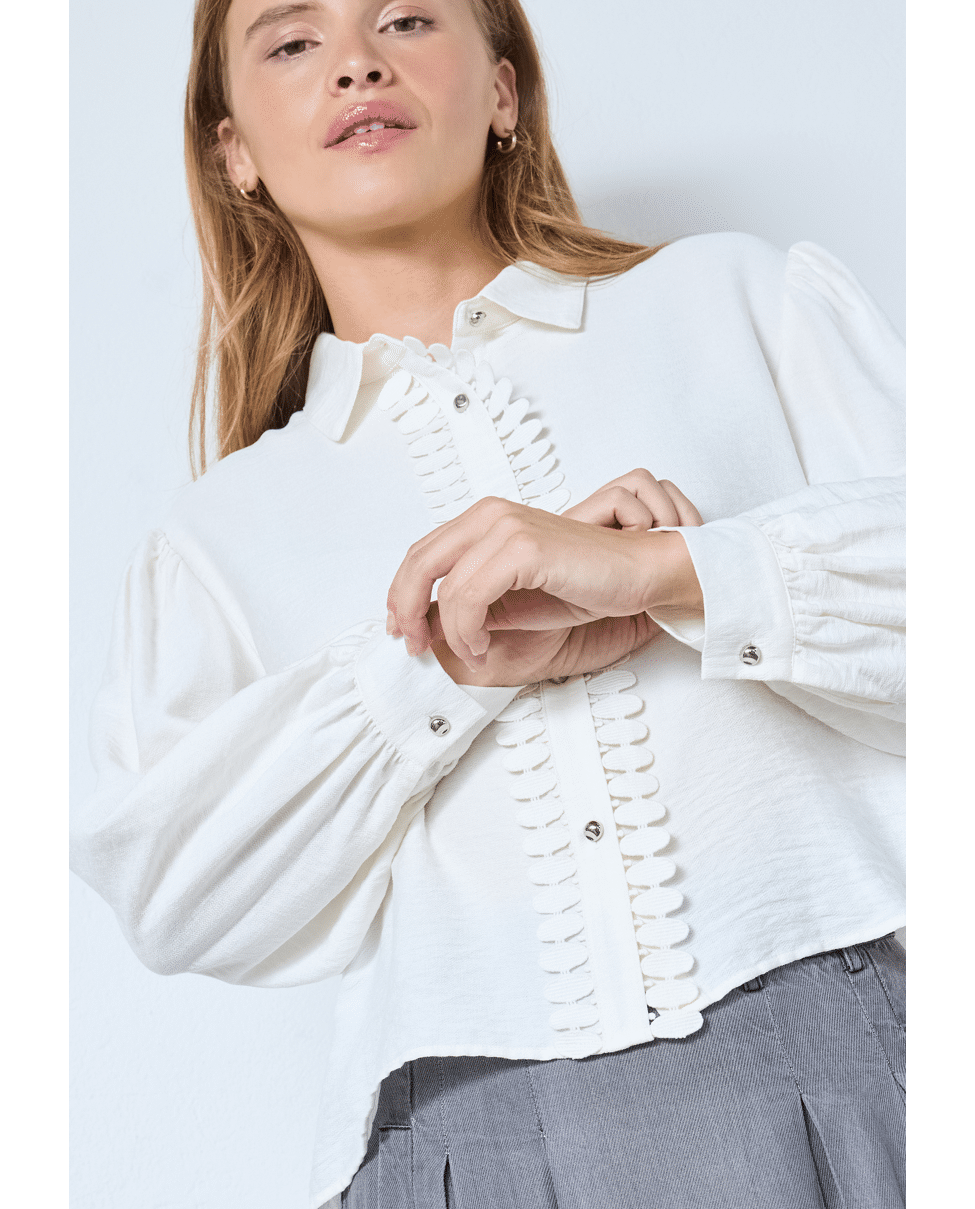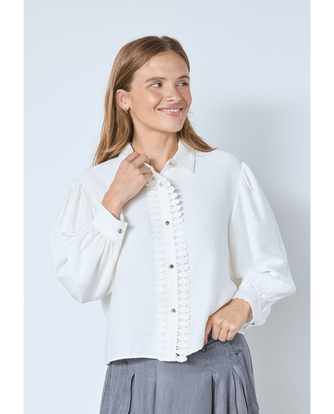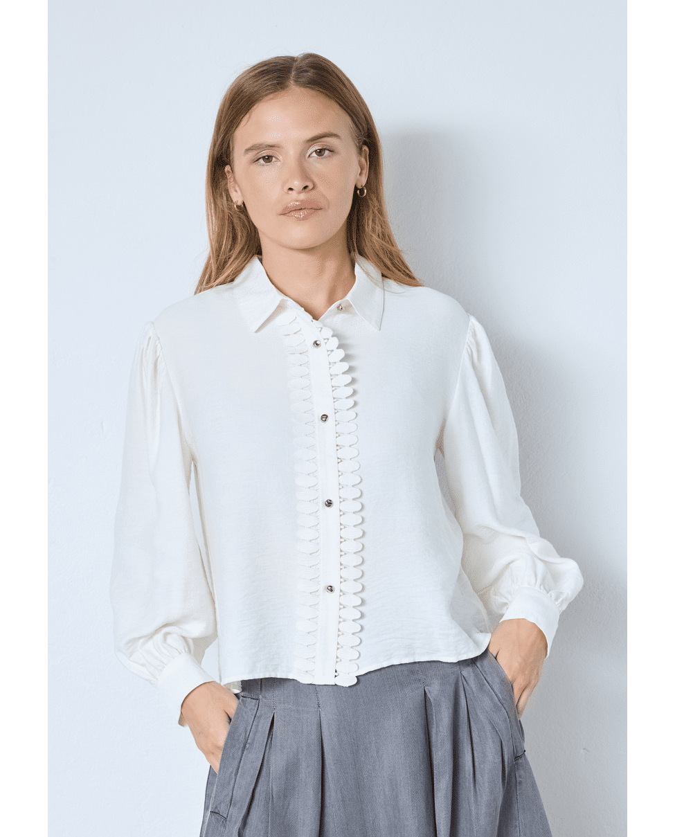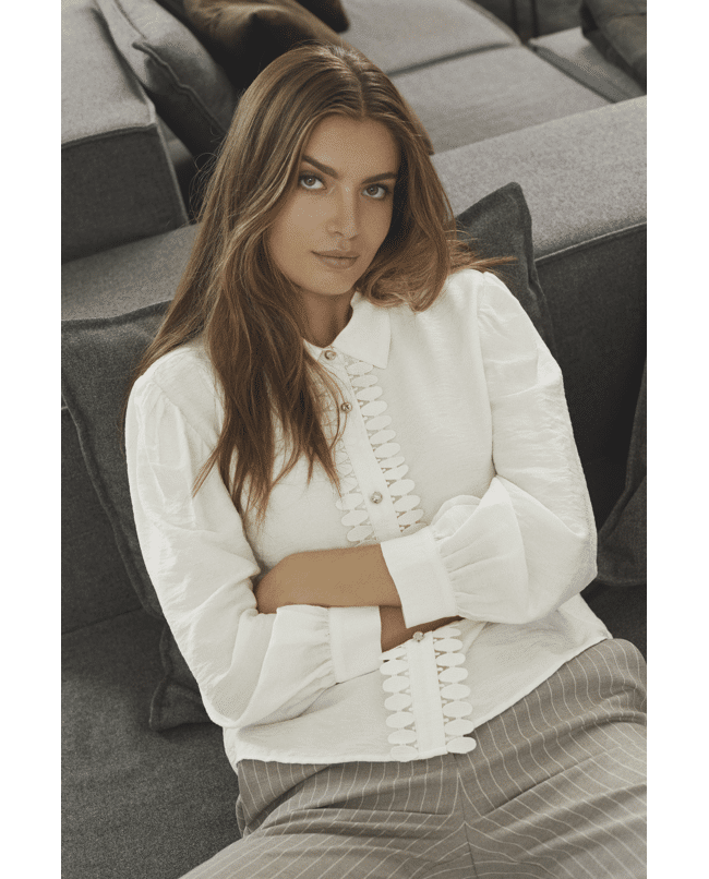De geplooide schouders en ruches geven de blouse een vrouwelijke twist, zonder te overdrijven — subtiel, stijlvol en tijdloos.