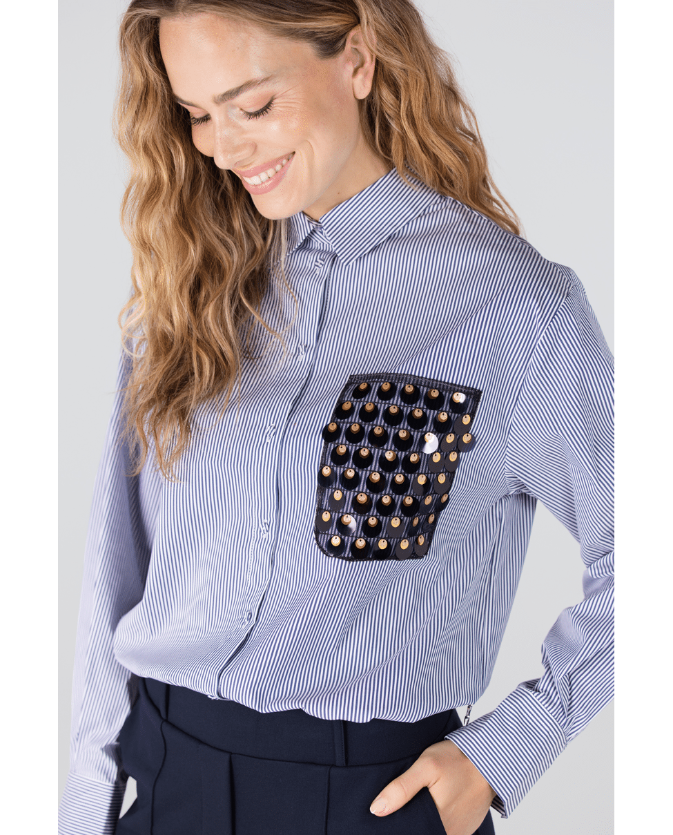 GOLDIE W25 - Gestreepte damesblouse van Jansen met pailletten op het borstzakje, overhemdkraag en lange mouwen