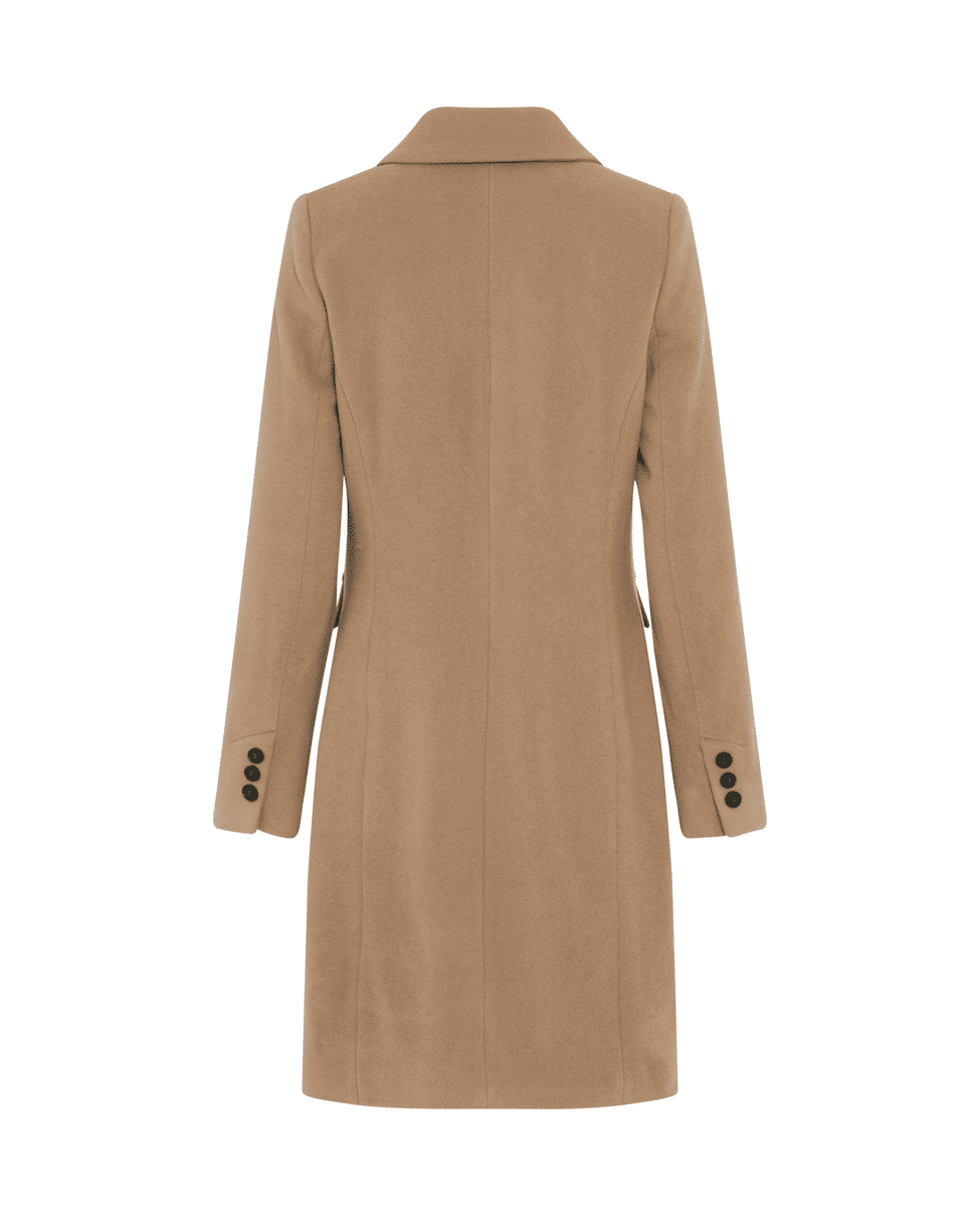De toevoeging van kasjmier maakt de jas heerlijk zacht en luxueus. De camel kleur geeft elke outfit een stijlvolle en veelzijdige basis.