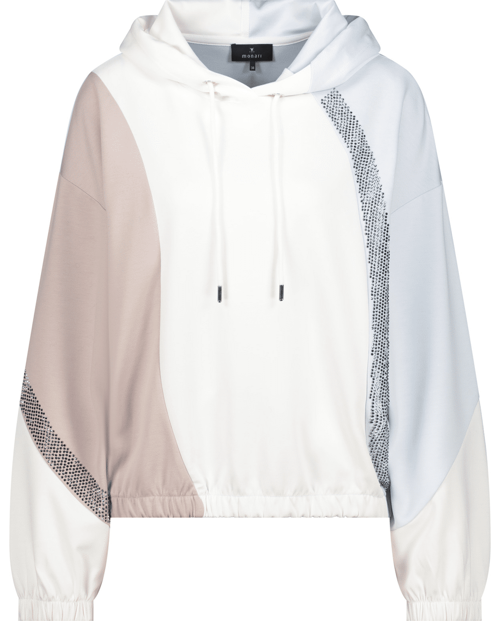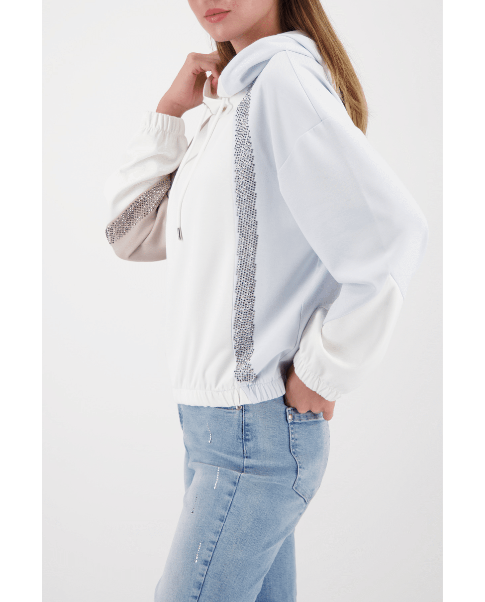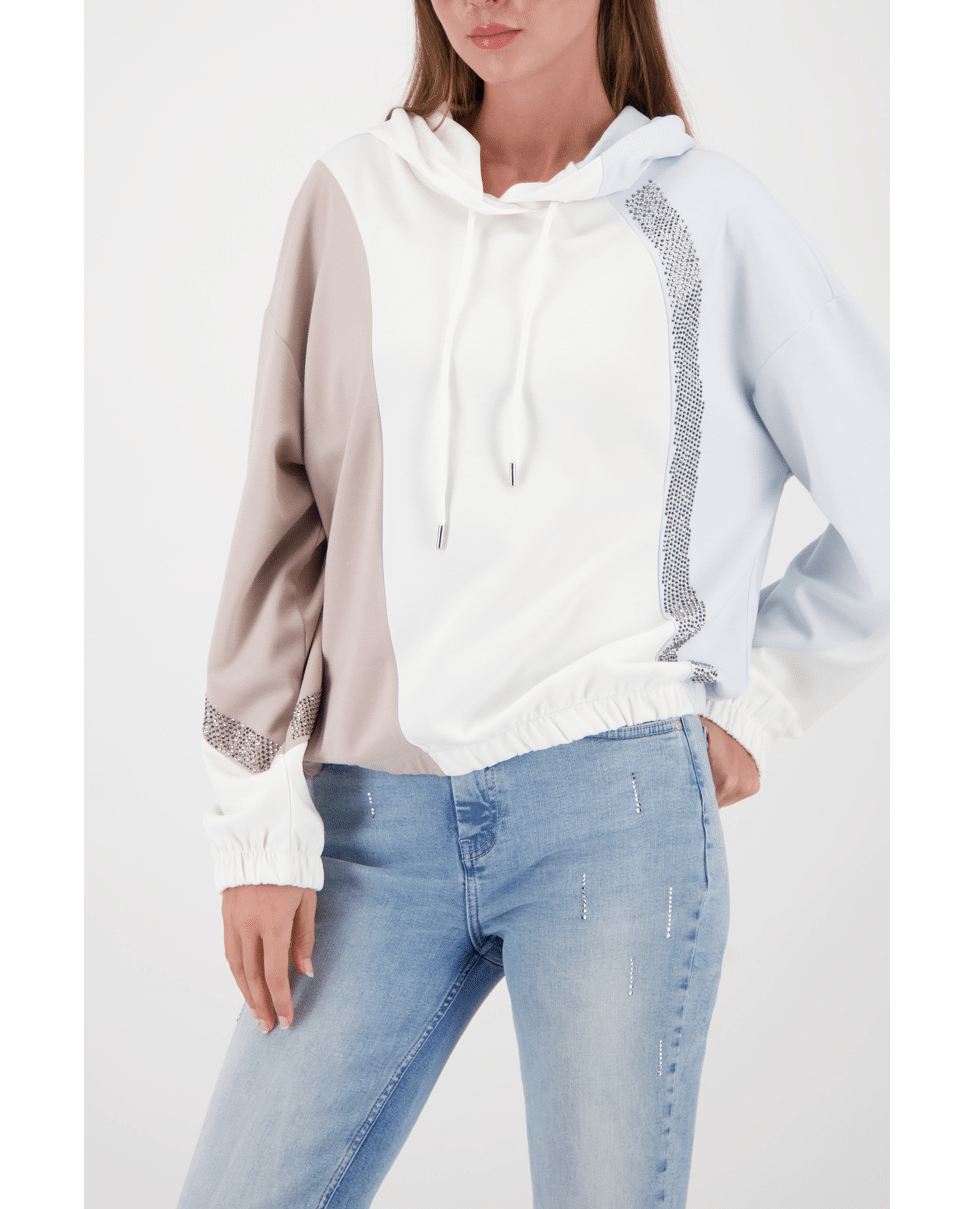 De kleurblokken en strassbanden geven deze hoodie een speelse én vrouwelijke uitstraling.