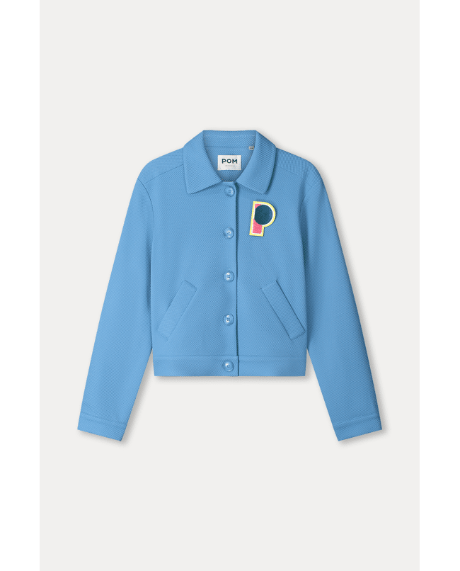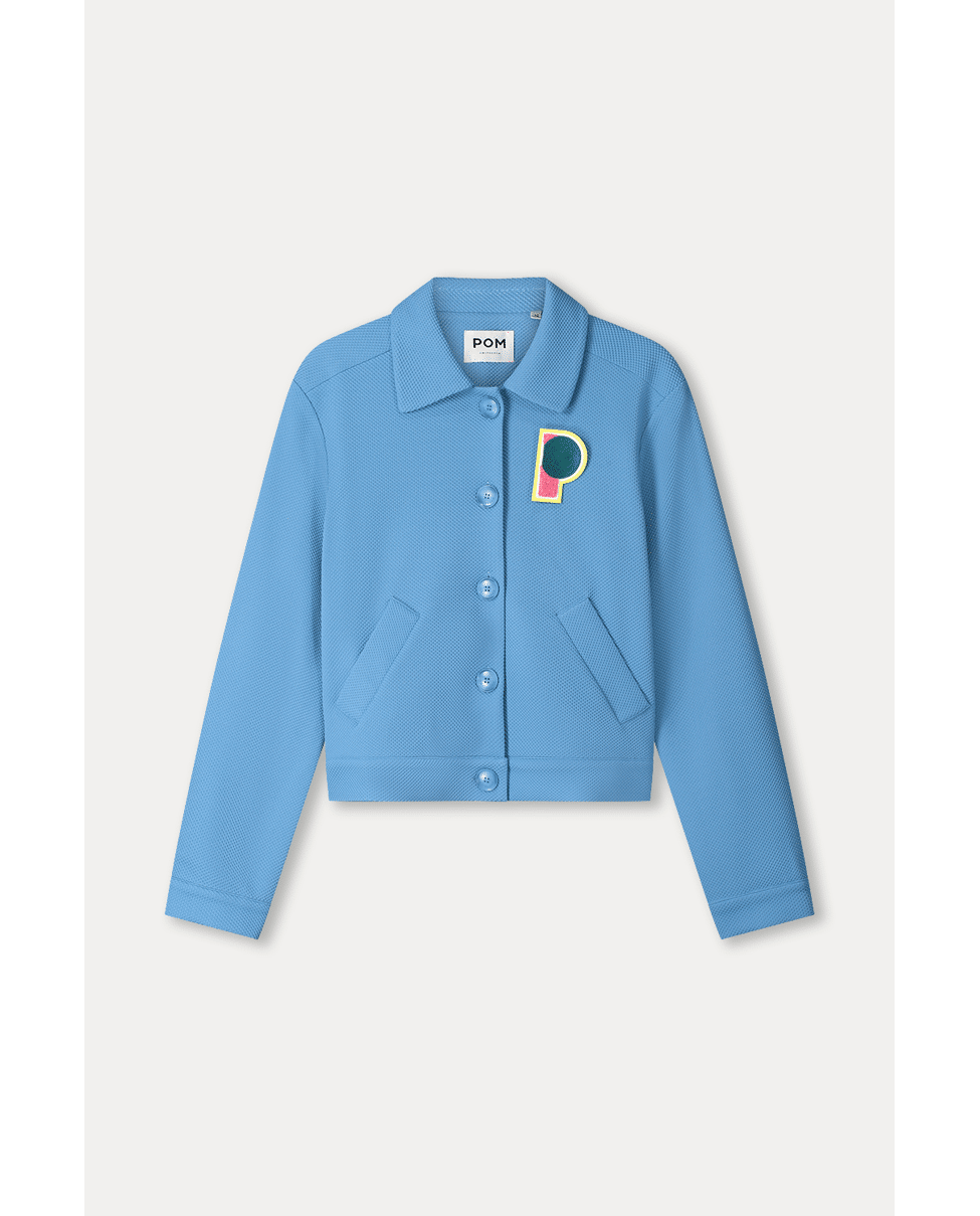Deze blauwe jas heeft een korte, rechte fit en een kleurrijke ‘P’-patch op de borst. Perfect als licht jasje op frisse lentedagen.