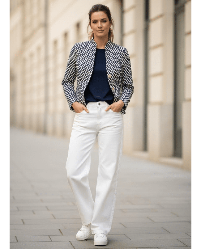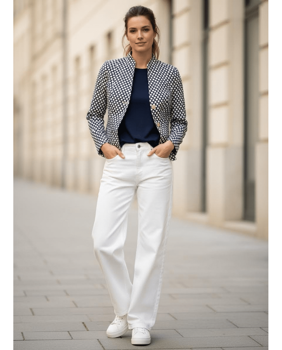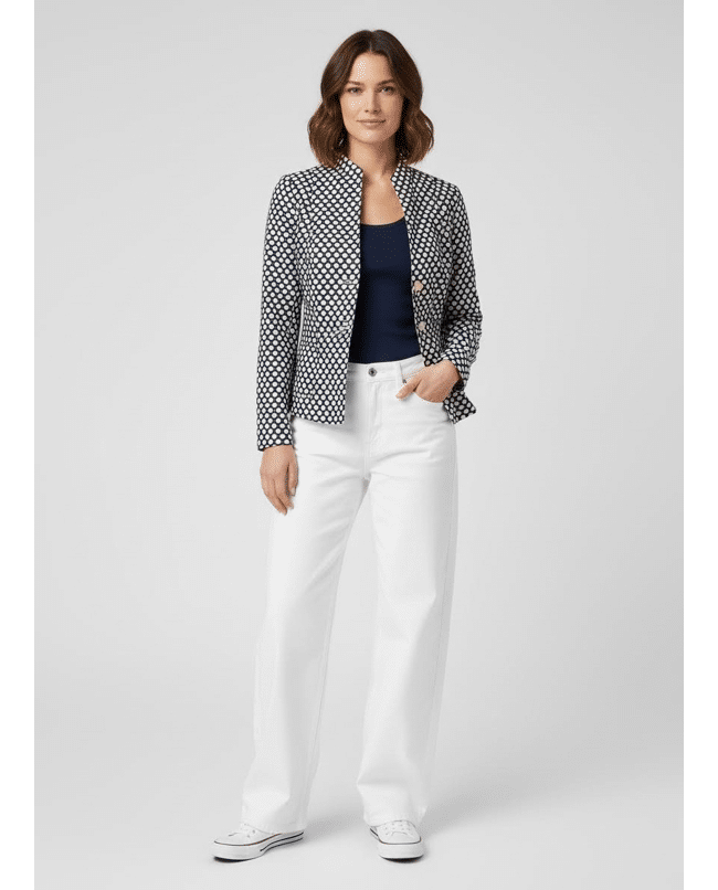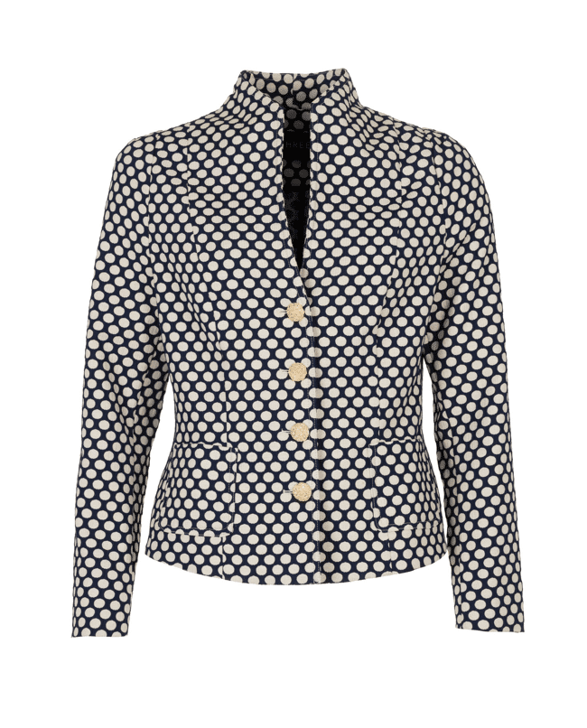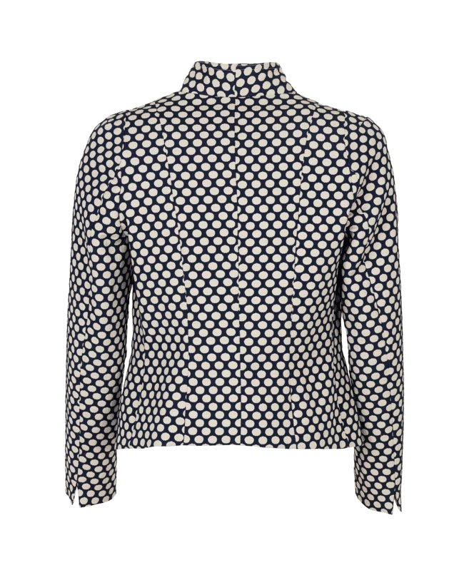 De combinatie van de klassieke snit met de frisse stippenprint maakt dit jasje net even anders. Stijlvol, maar met een knipoog.