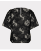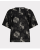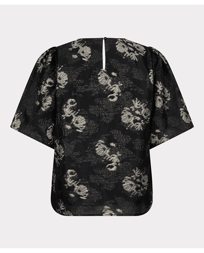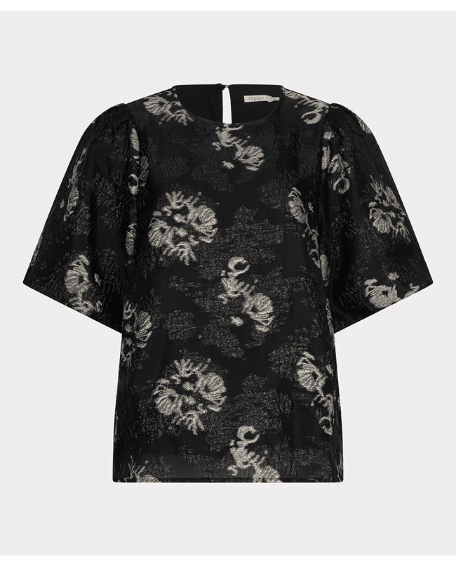Deze zwarte jacquard top met subtiele glans en pofmouwen is een elegante keuze voor feestelijke momenten. Combineer met een rok of high-waist jeans voor een complete look.