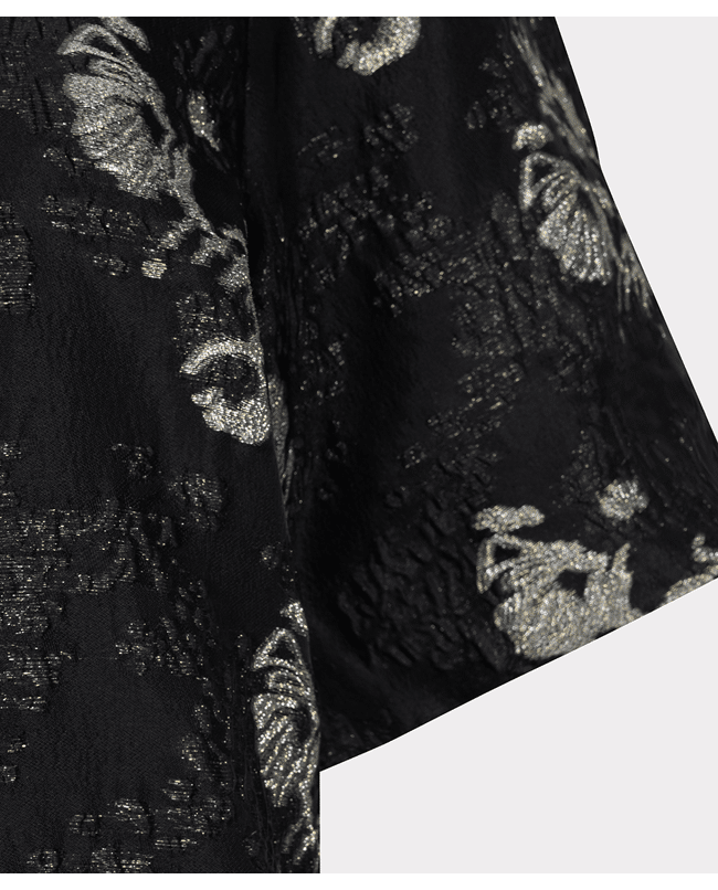 De rijke jacquardstof en volumineuze mouwen geven deze top een luxe uitstraling – stijlvol en toch comfortabel.