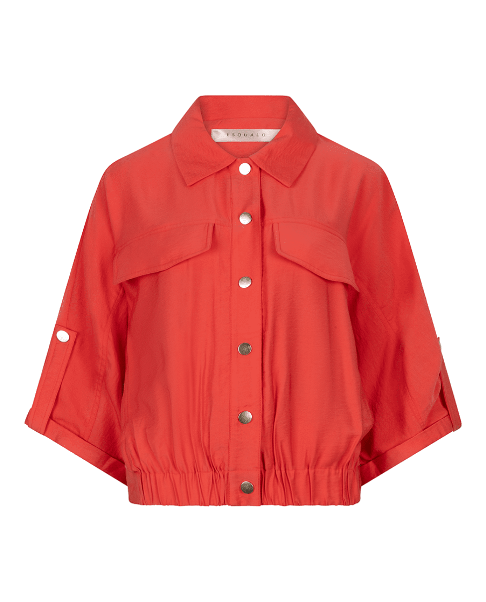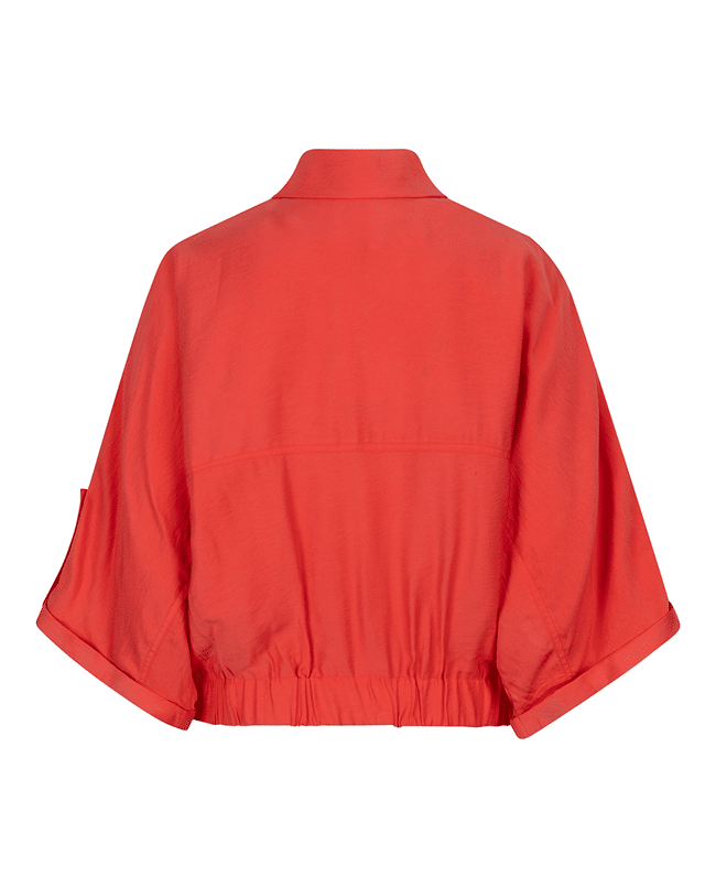 Een zomers jasje in chili red, uitgevoerd in een lichte Tencelmix met subtiele slubstructuur. Het korte model met halve mouwen zorgt voor een frisse, moderne look.