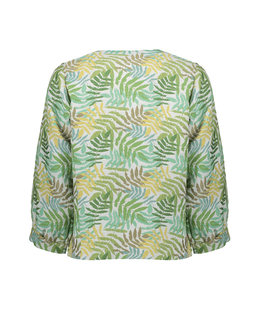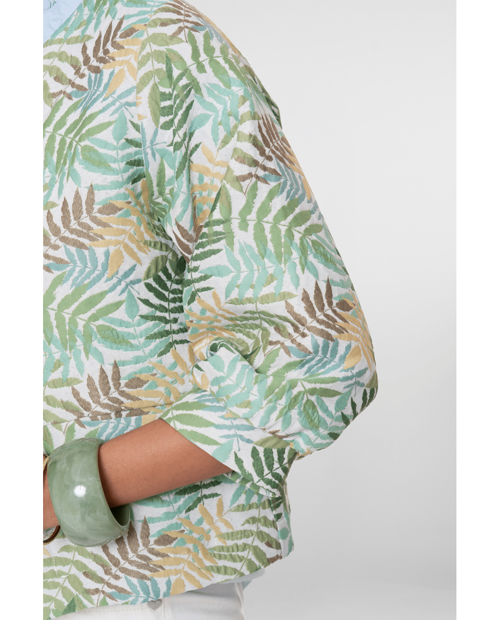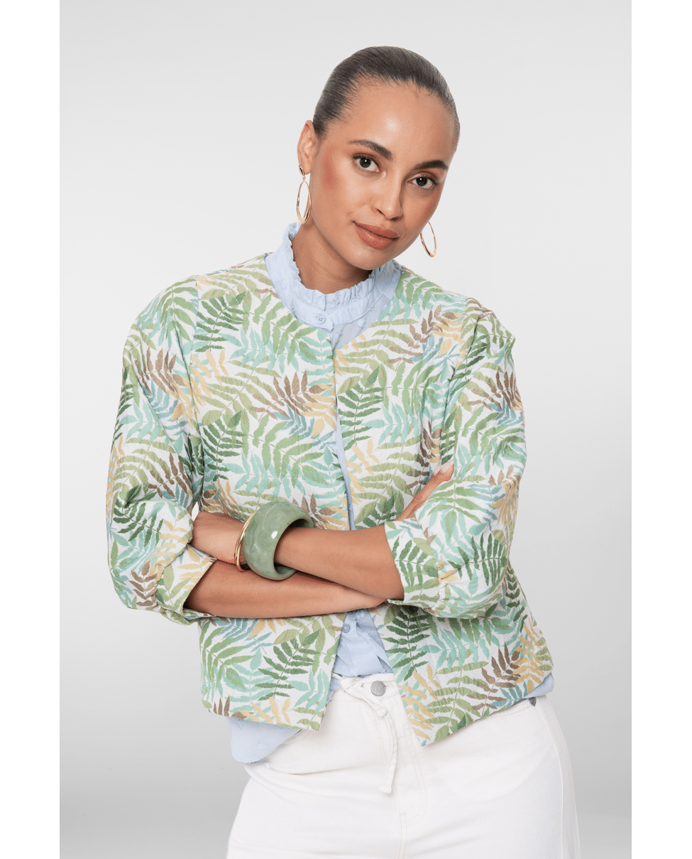 Een opvallend jasje met tropische flair. Het bladerendessin en de elegante haakjessluiting maken dit item perfect voor een frisse lentelook met een twist.