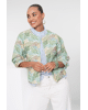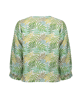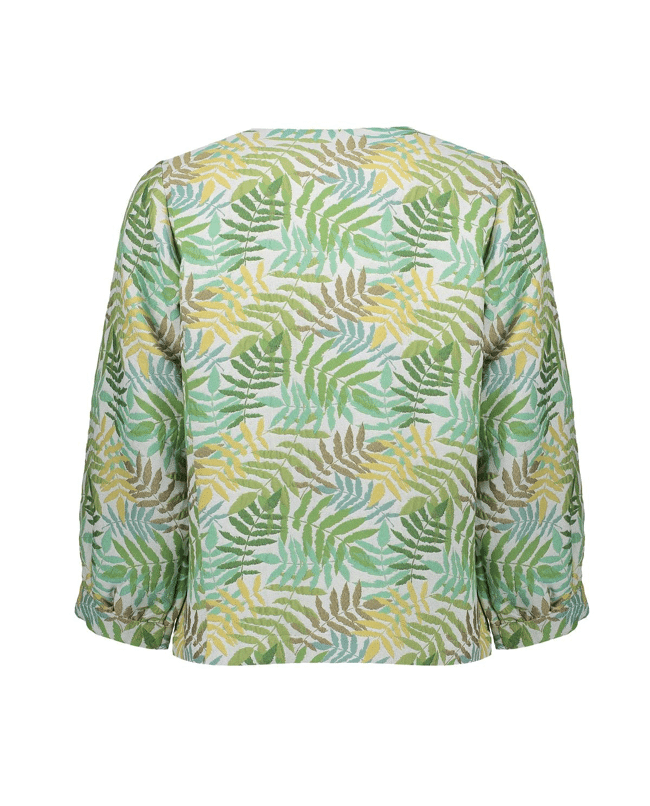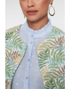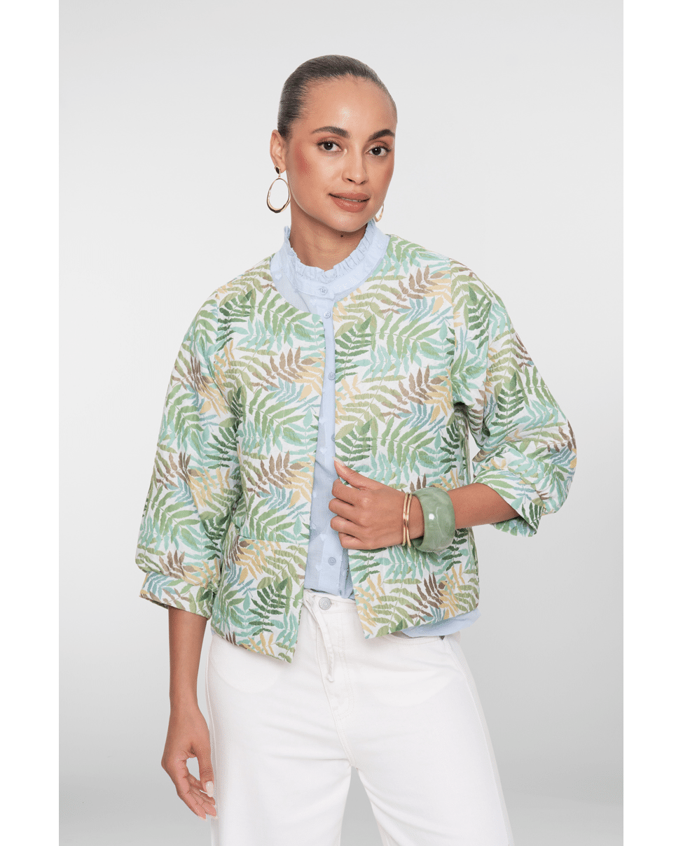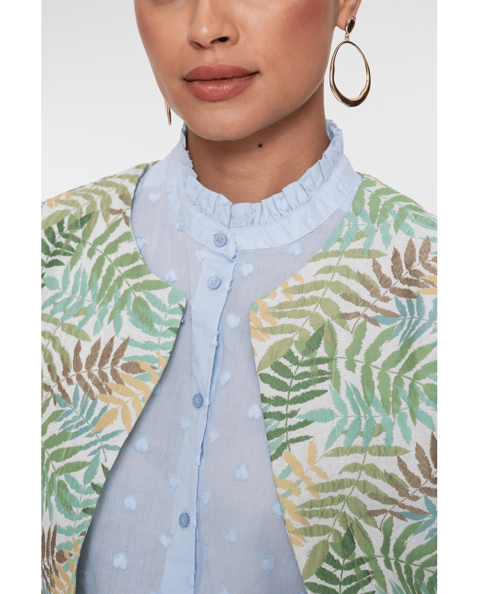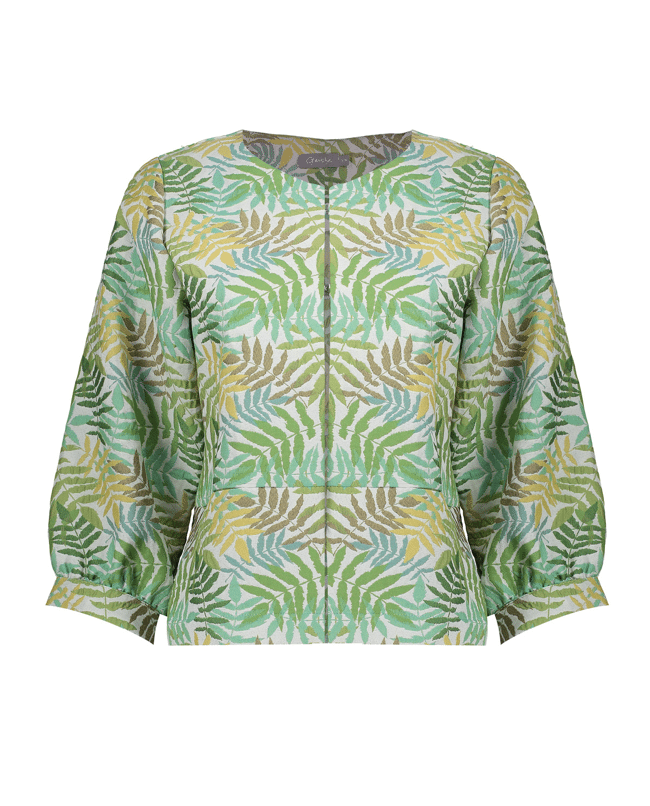Een opvallend jasje met tropische flair. Het bladerendessin en de elegante haakjessluiting maken dit item perfect voor een frisse lentelook met een twist.