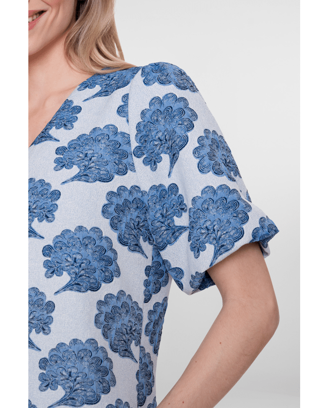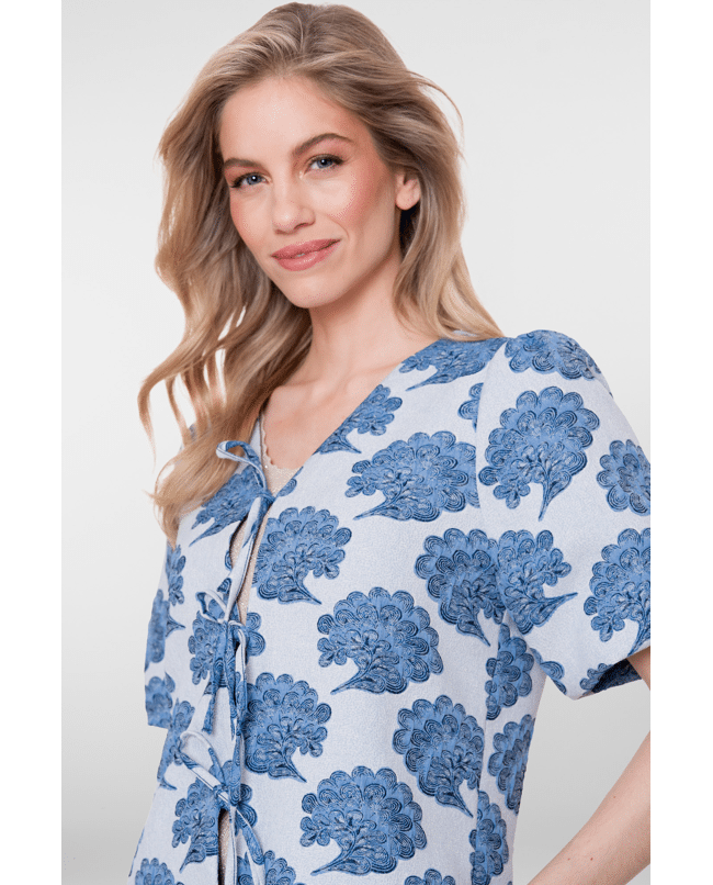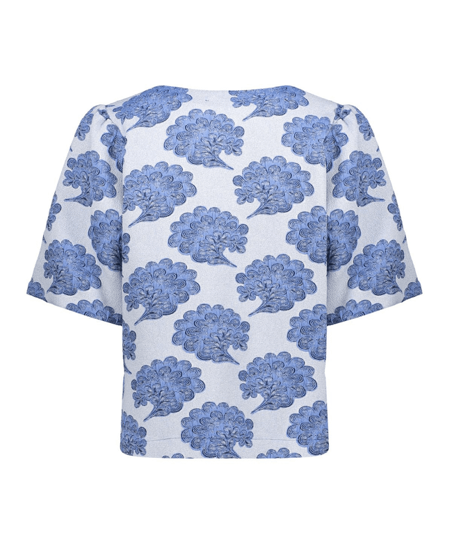 • All-over print in blauw/off-white