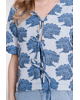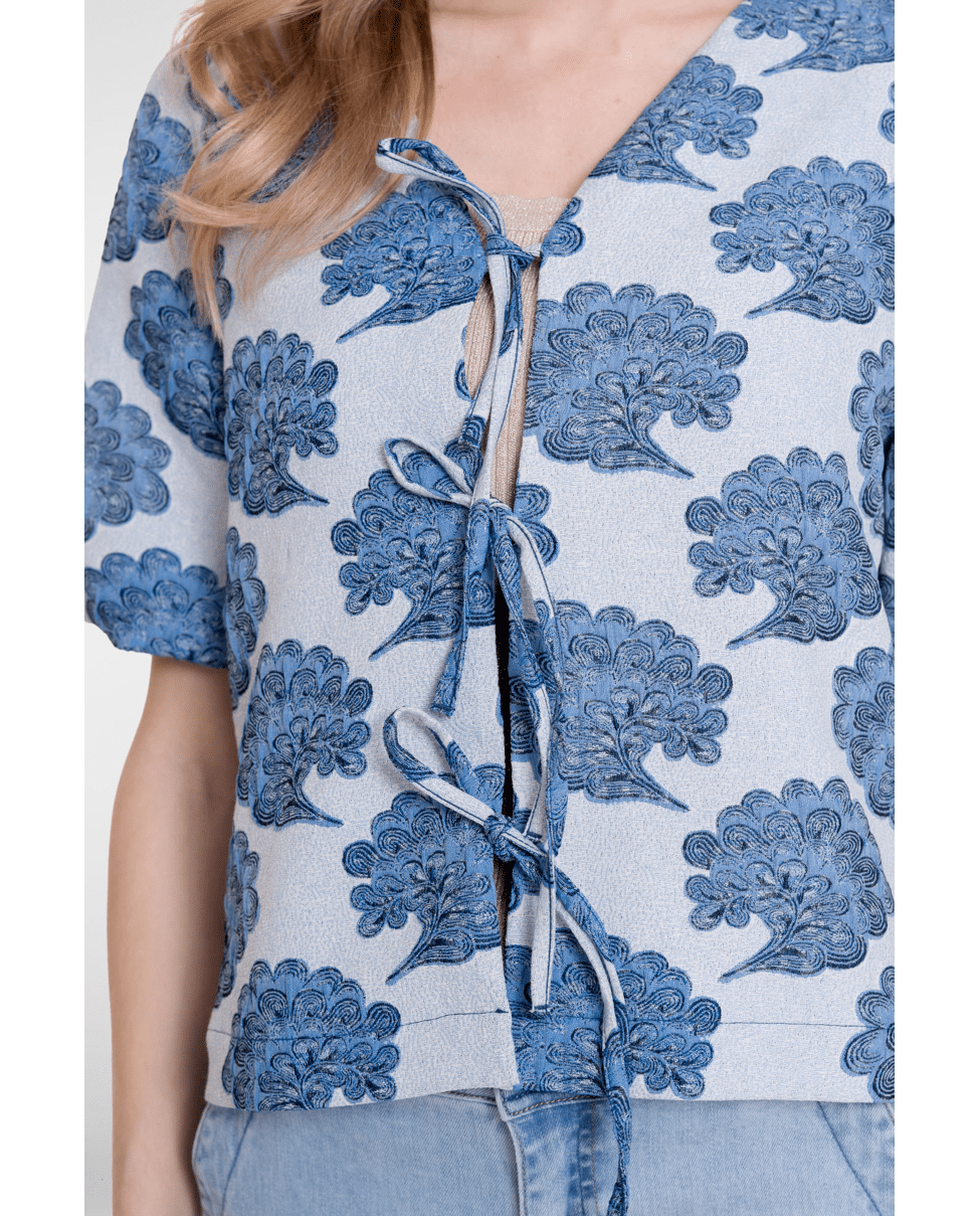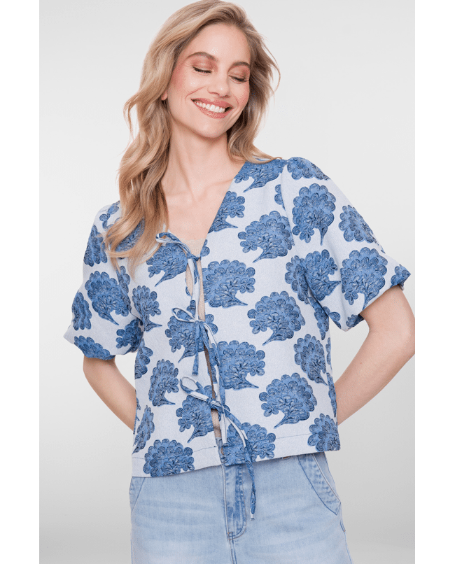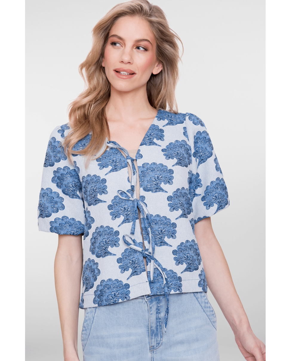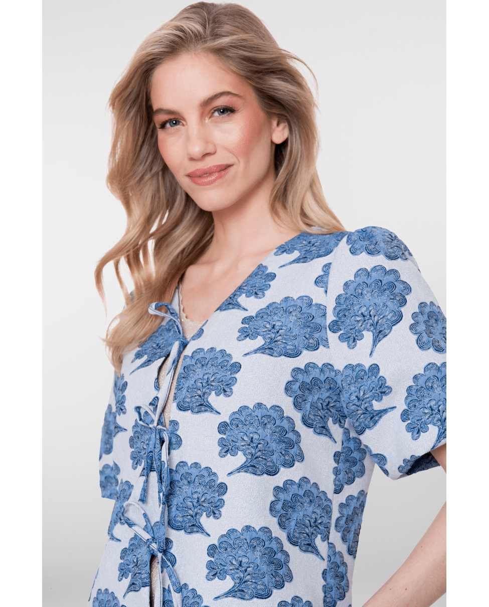 Dit blauwe dames jasje van Geisha met all-over print is een stijlvolle toevoeging aan je lente- en zomergarderobe. De off-white basis met verfijnde blauwe print geeft een frisse, moderne uitstraling. Mooi als licht zomerjasje of als statement piece op een eenvoudige top.