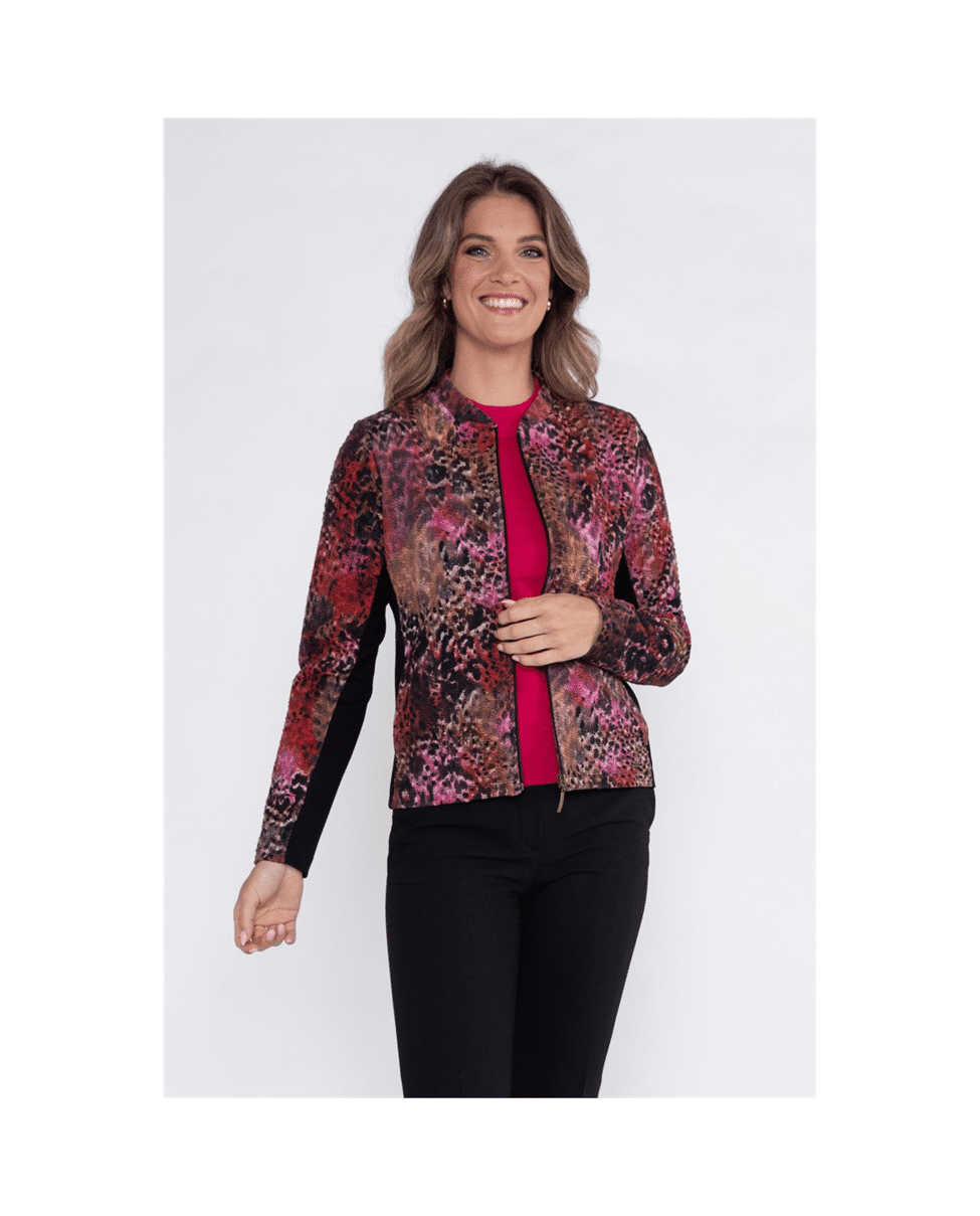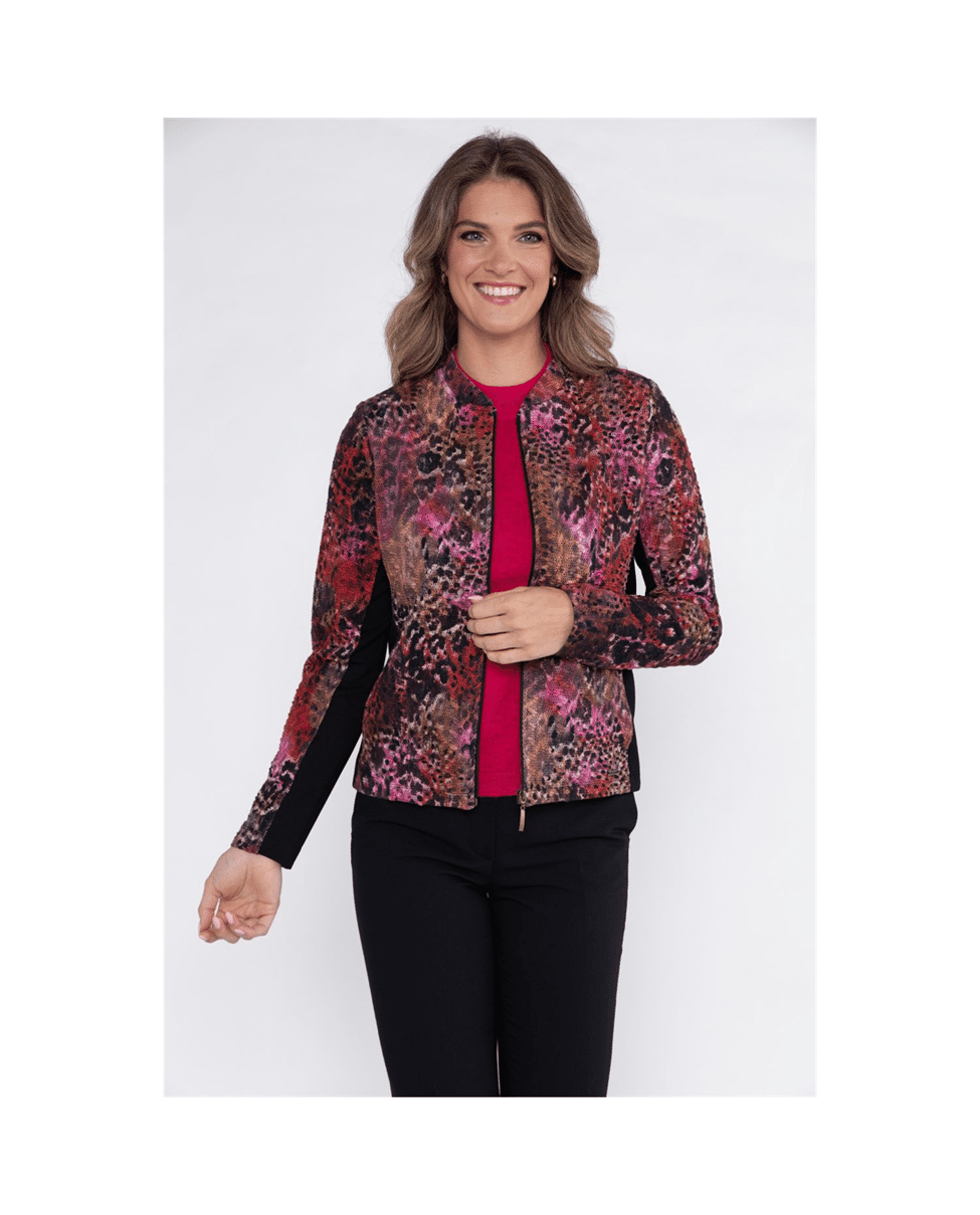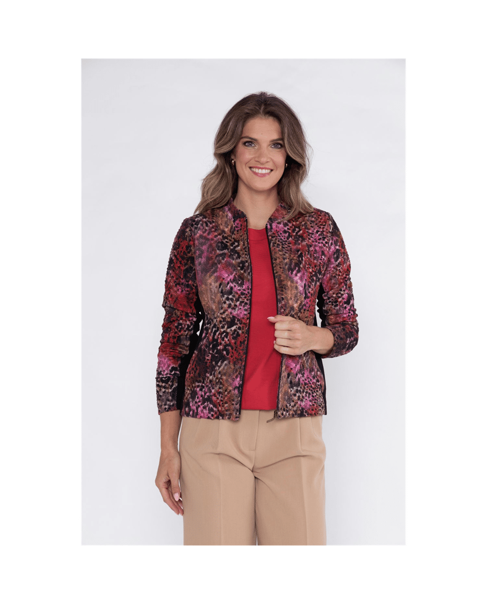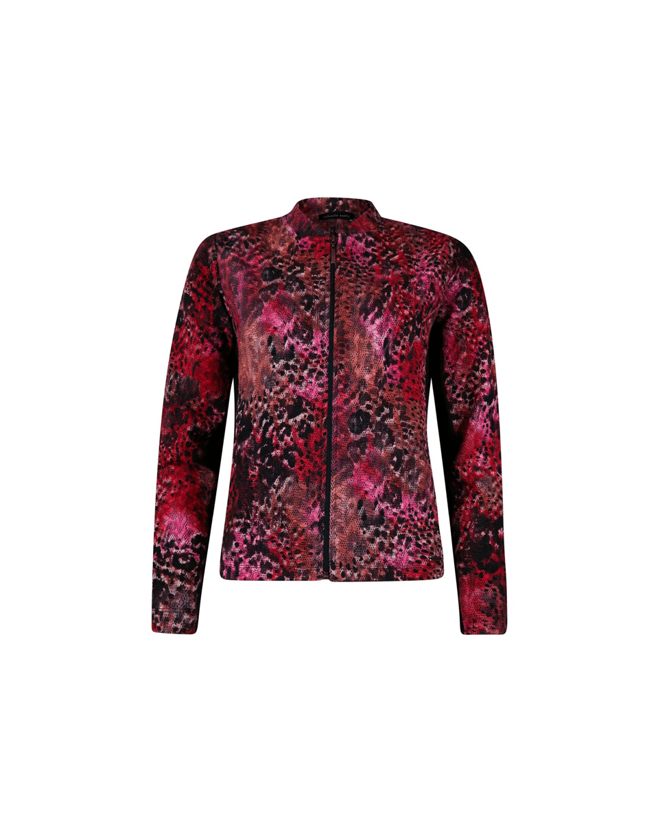 Een licht en comfortabel jasje in scarlet-black faded animal print. Dit ongevoerde model met ronde hals en klein opstaand kraagje is uitgevoerd in een katoenmix structuur jersey en voelt bijna zo prettig als een vest.