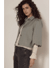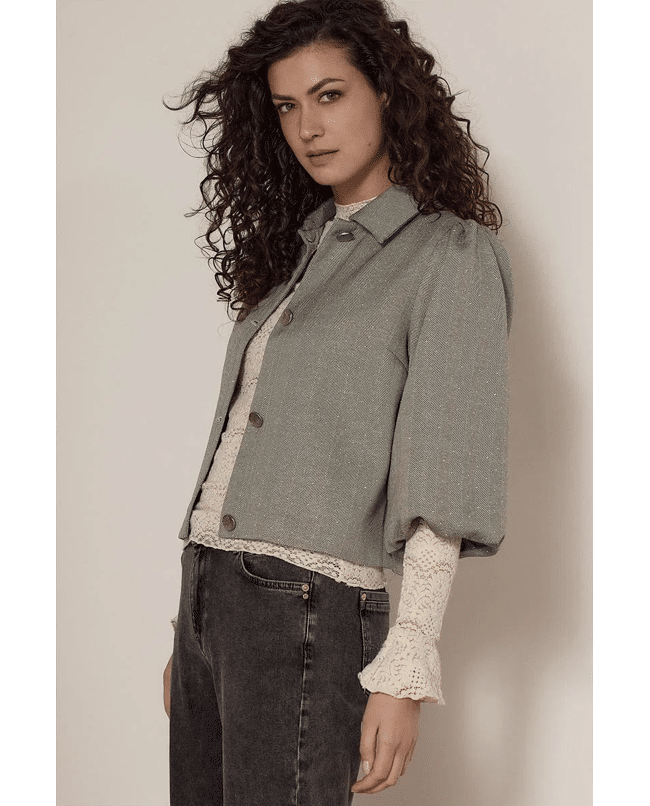Een elegante korte jas met een luxueuze visgraatstructuur. De Balloon-Sleeve Jacket Fancy Herring combineert een klassieke stijl met moderne flair dankzij de opvallende ballonmouwen en subtiele glans.