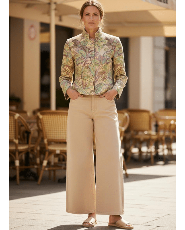 Een getailleerd jasje met karakter. De kleurrijke tropenprint en verfijnde pasvorm maken dit een opvallend item voor lente of zomer. Draag het als blazer of als licht jasje over een effen outfit.