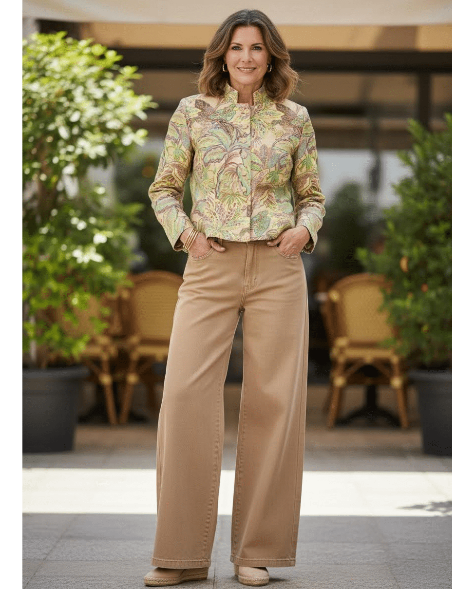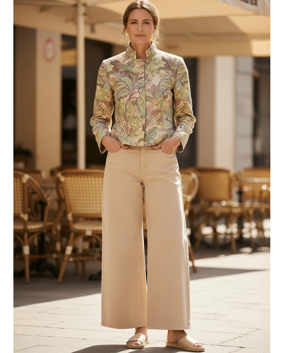 Het opstaande kraagje en de levendige print geven dit jasje een stijlvolle twist – perfect voor wie houdt van uitgesproken, vrouwelijke looks.