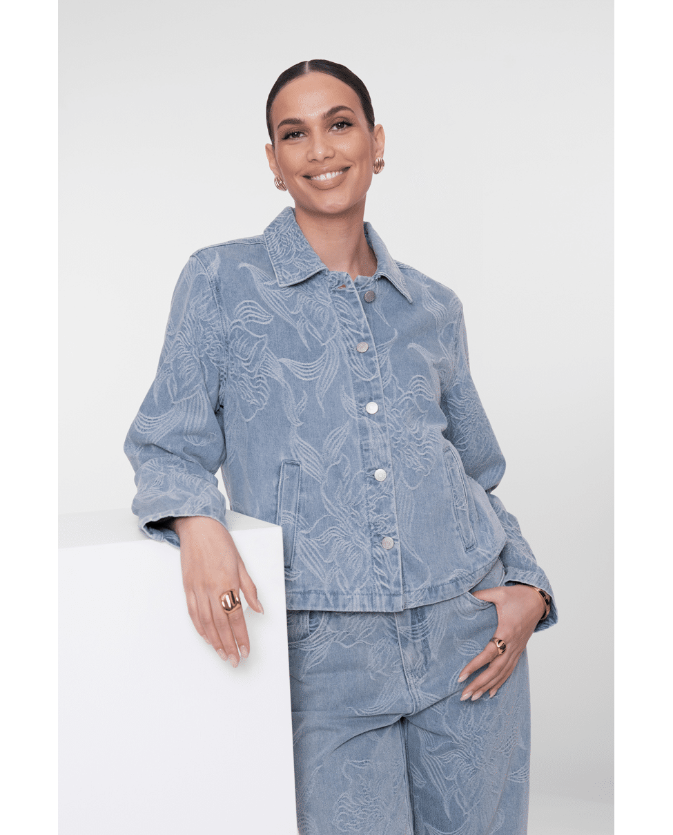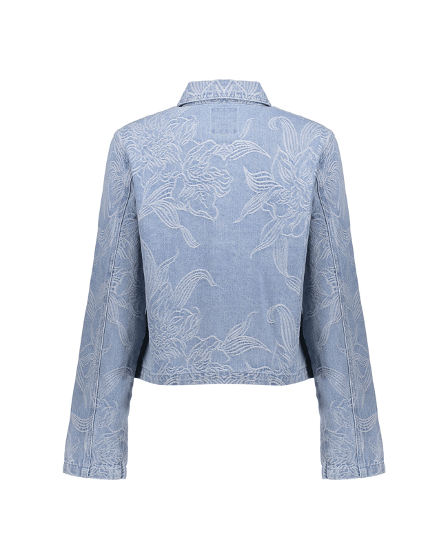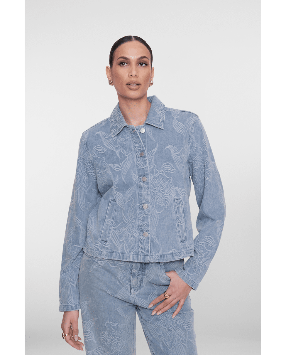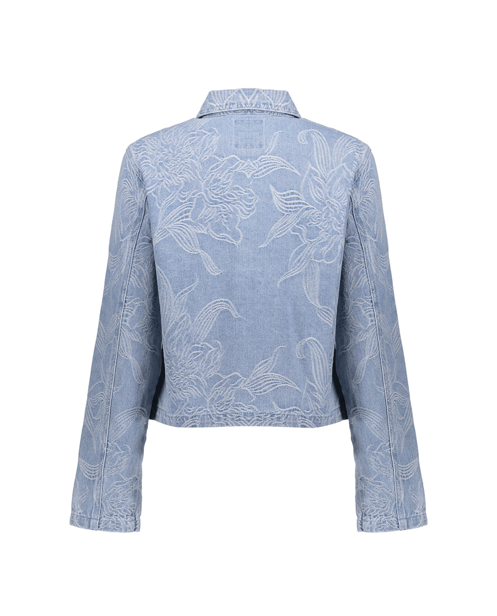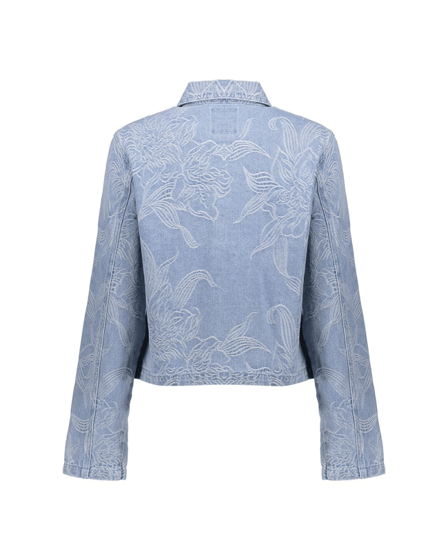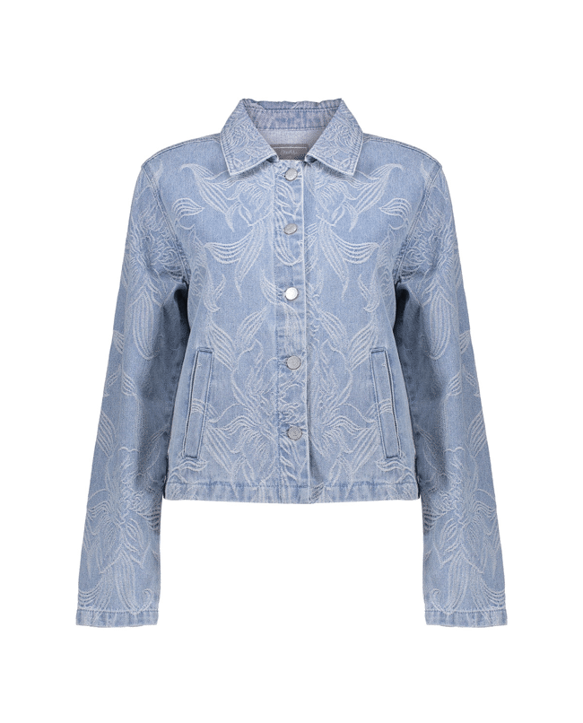 Dit jeansjack in bleached denim krijgt een verfijnde twist dankzij het ingeweven bloemenpatroon. Ideaal als lichte tussenjas voor frisse lenteochtenden of koele zomeravonden.