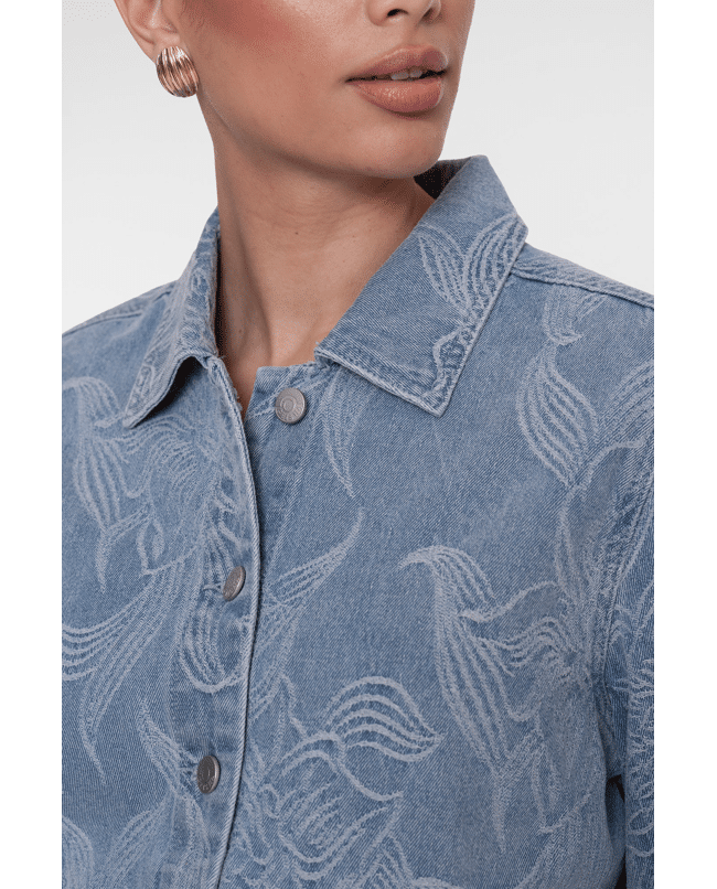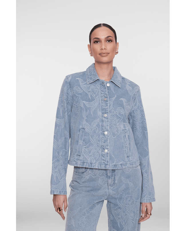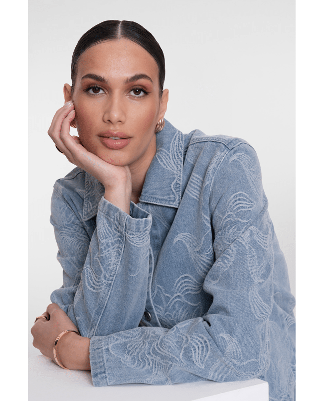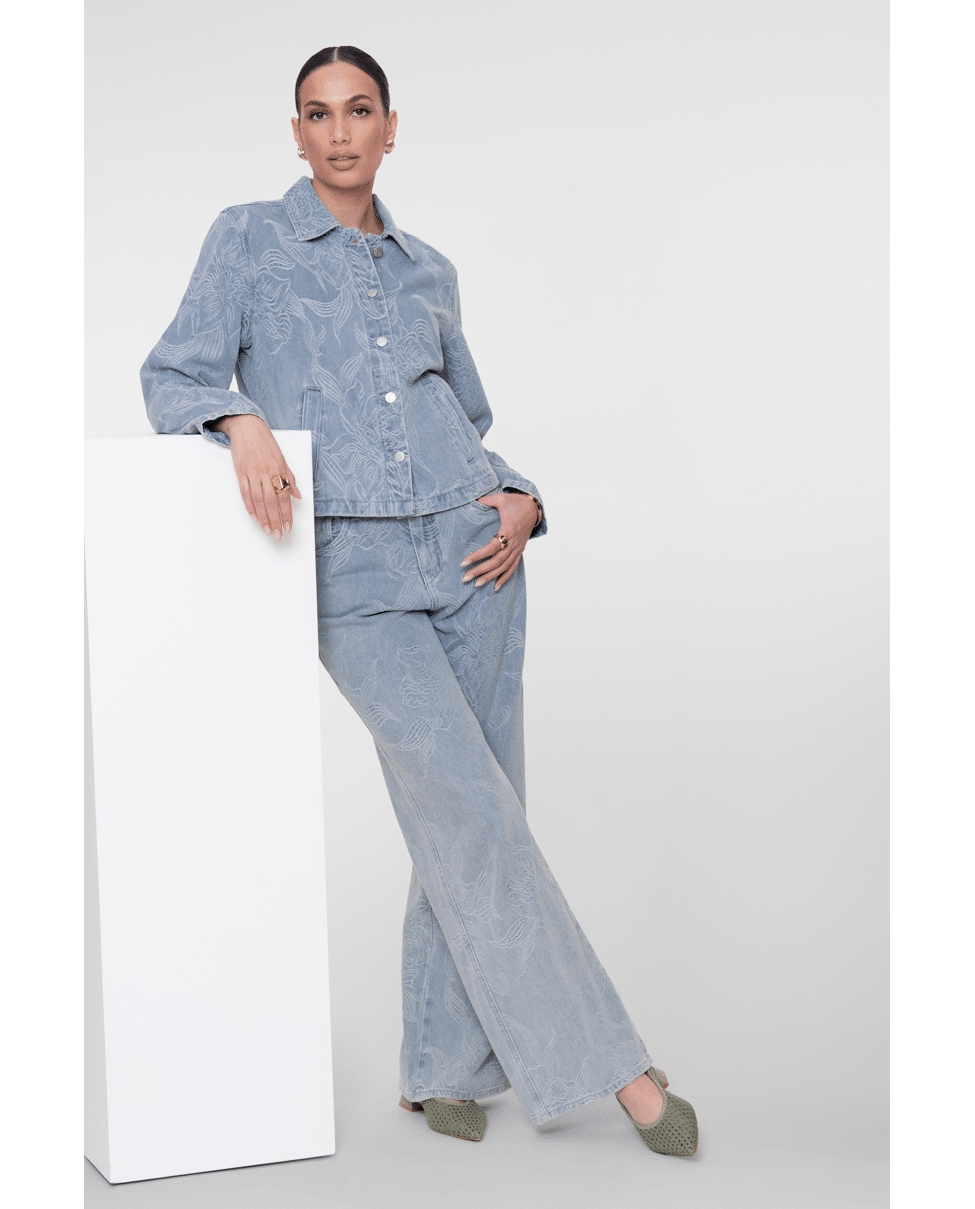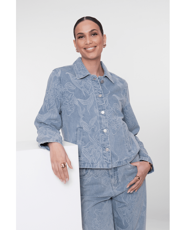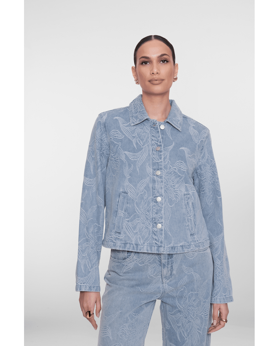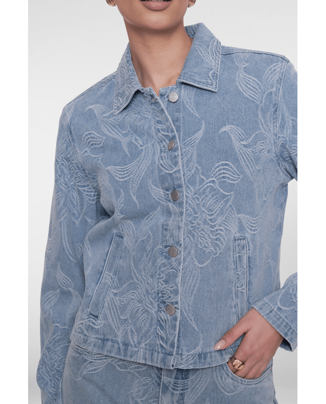 Dit jeansjack in bleached denim krijgt een verfijnde twist dankzij het ingeweven bloemenpatroon. Ideaal als lichte tussenjas voor frisse lenteochtenden of koele zomeravonden.