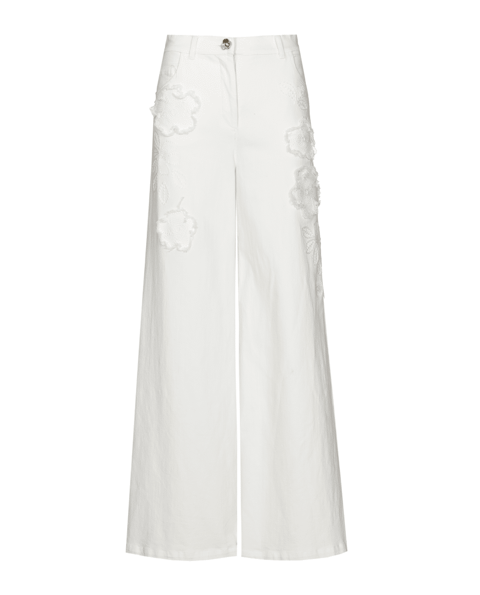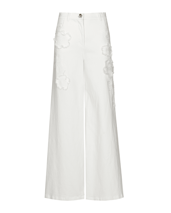 De ton-sur-ton bloemenbroderie geeft deze broek een subtiel artistiek accent zonder op te vallen.